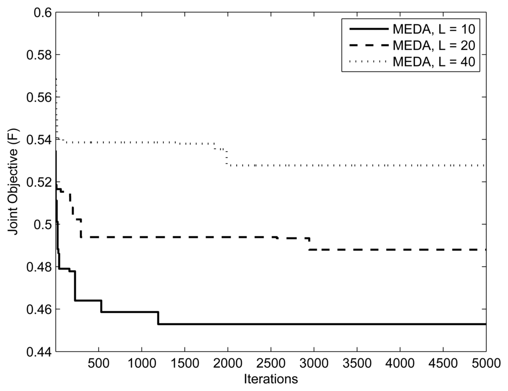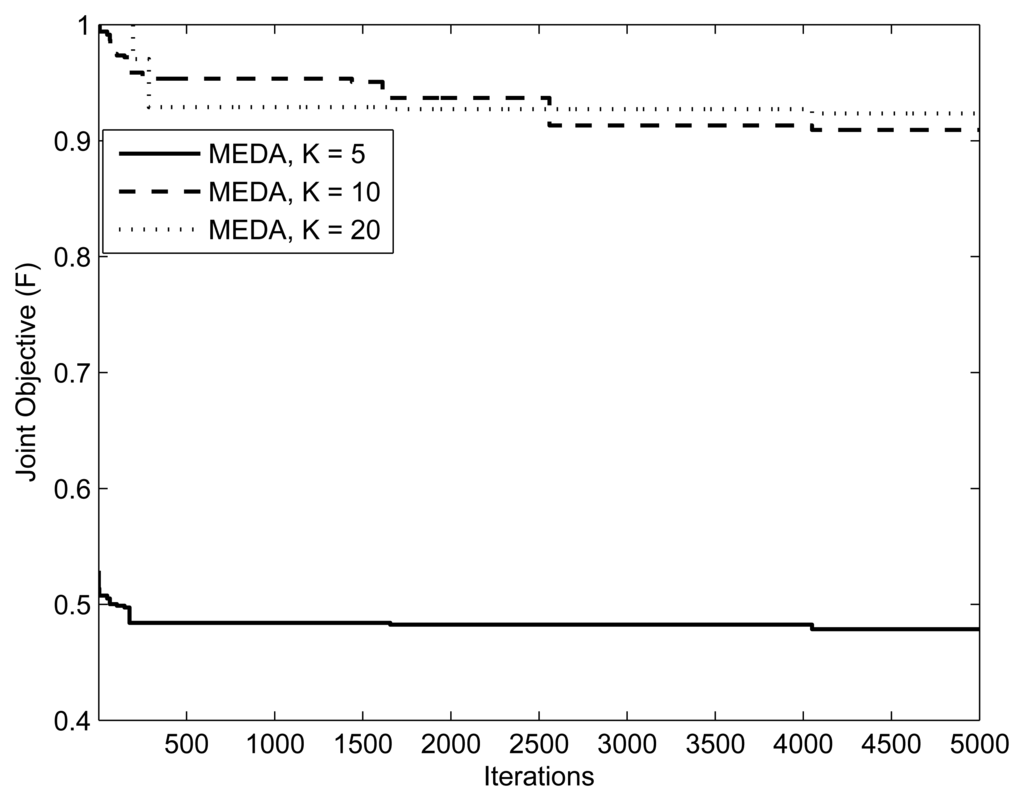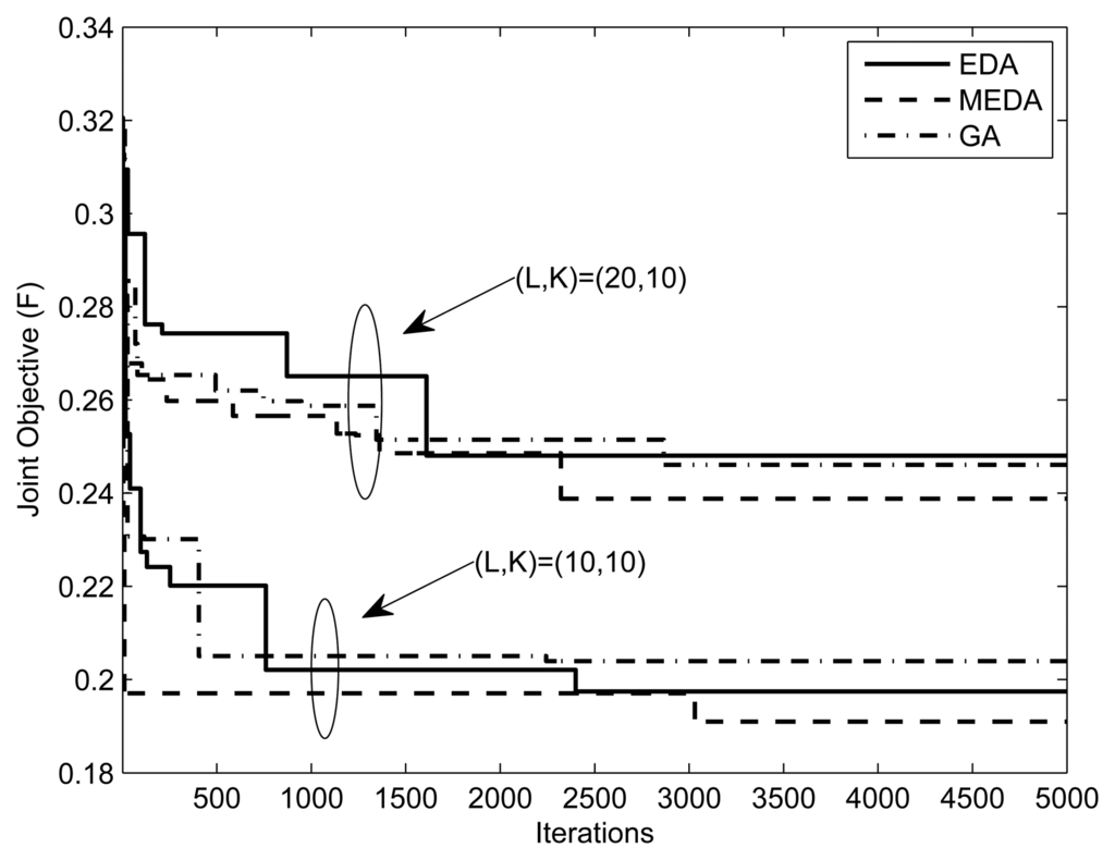 Figures 7 and 8 present the fitness vs. iterations plot for different numbers of relays and users. The fitness function was defined in Equation (7). The parameters are and (1, 10mW, 0.5, 0.5, 5), respectively. The value of threshold γ is set to 0.3. From the results, we can observe that the performance of MEDA is better than EDA and GA. This is because a simple EDA and GA can get stuck in the local optimum after a few iterations. We can also note that fitness values with less relays is better than fitness values with more relays. This is because the assignment takes more iterations for a large number of relays.