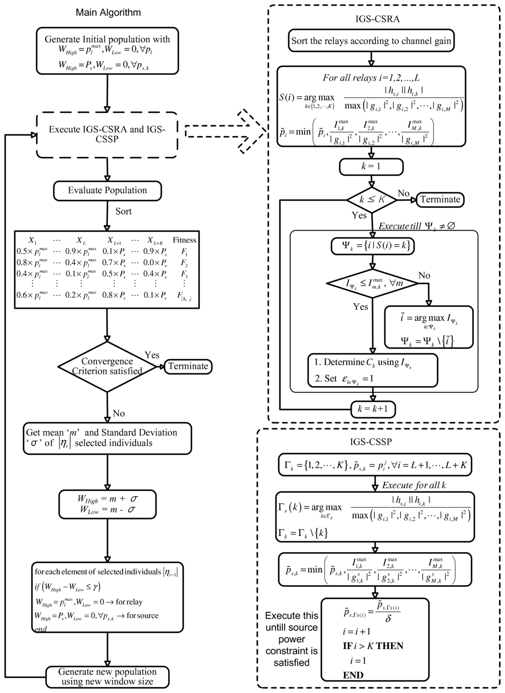We propose an iterative greedy scheme for constraint satisfaction and relay assignment (IGS-CSRA). The IGS-CSRA ensures that the constraints C1, C3 and C5 are satisfied. We also propose an iterative algorithm for the source power such that constraints C2 and C4 are satisfied. We call this method the iterative greedy scheme for constraint satisfaction of source power (IGS-CSSP). The IGS-CSRA and IGS-CSSP are shown in Figure 2 and described in Sections 3.2 and 3.3. At the end of this step, the algorithm has a population, which comprises individuals with feasible relay and source power levels and the associated assignment variables ε.