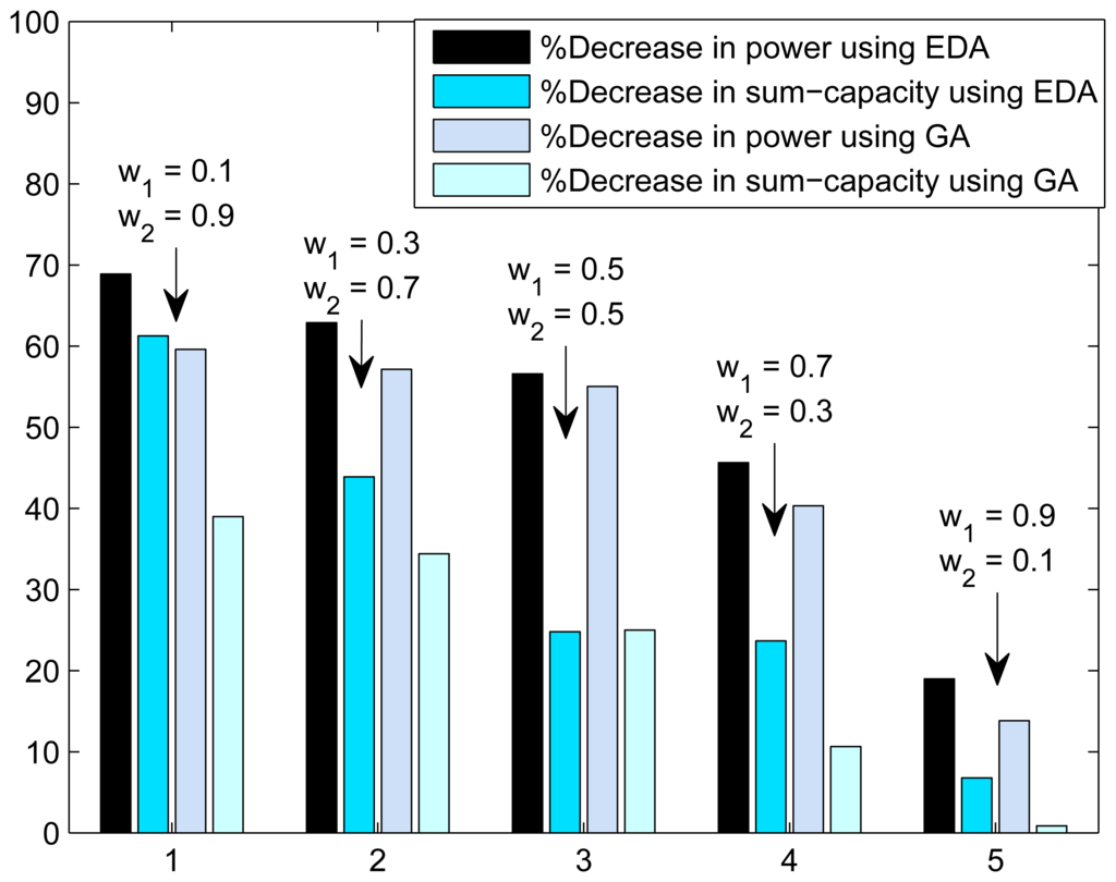 We compare the results of EDA and MEDA with the standard continuous genetic algorithm (GA) []. The EDA, MEDA and GA use IGS-CSSP and IGS-CSRA for constraint satisfaction. We will use the the word “non-green communication” when we set w1 = 1 and w2 = 0. In all the simulation results, we set the (M)EDA/GA parameters as (Δt, ρs, ITer) = (20, 0.5, 1000), where Δt, ρs, ITer are the population, selection probability and maximum iteration, respectively.
