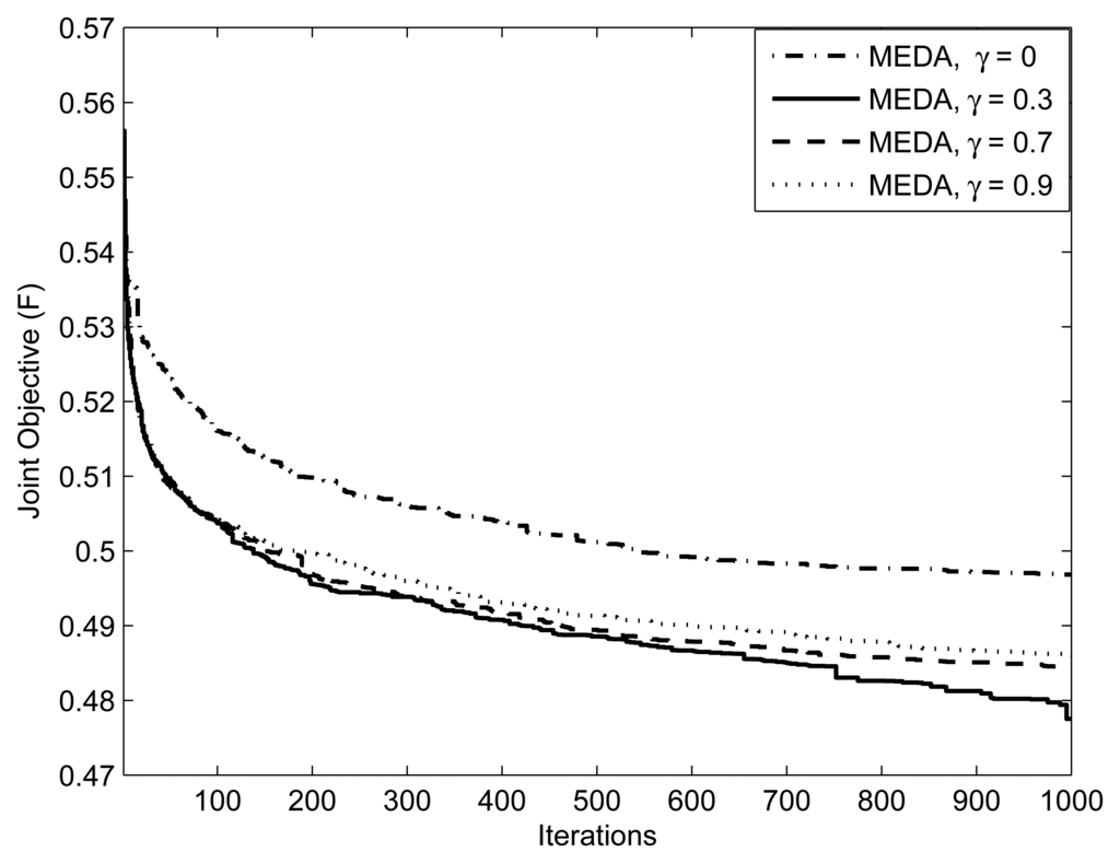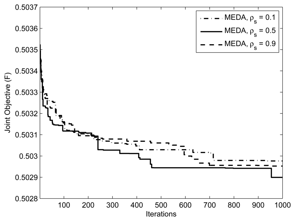 Figure 5 focuses on the method of applying thresholds on EDA, which is described in section 3.4. We ran an EDA with parameters for threshold values = {0.3, 0.7, 0.9}. Note that setting γ= 1 is equivalent to not applying the threshold at all. Setting the threshold closer to 1 means that the algorithm generates the population from an almost identical distribution in each iteration; that is, the algorithm does not take advantage of the natural selection. An interesting issue is what values of the threshold facilitates the computation. From Figure 5, we can observe that the performance of EDA is poor at γ = 0.9 and 0.7. We can interpret this as, at the threshold values of γ = 0.9 and 0.7, which are close to 1.0, the algorithm does not evolve significantly. Figure 6 presents the effect of selection probability, ρs, on the performance of EDA. The parameters are . From Figure 6, we can observe that the performance of EDA is better if selection probability, ρs, is not close to either 0 or 1. There will be no evolution if selection probability, ρs, is close to 1, the EDA will behave like a random algorithm. On the other hand, if selection probability, ρs, is close to 0, the algorithm does not evolve significantly, because it is more likely that EDA will get stuck in the local optimum.