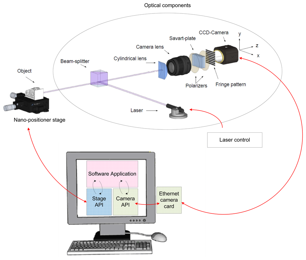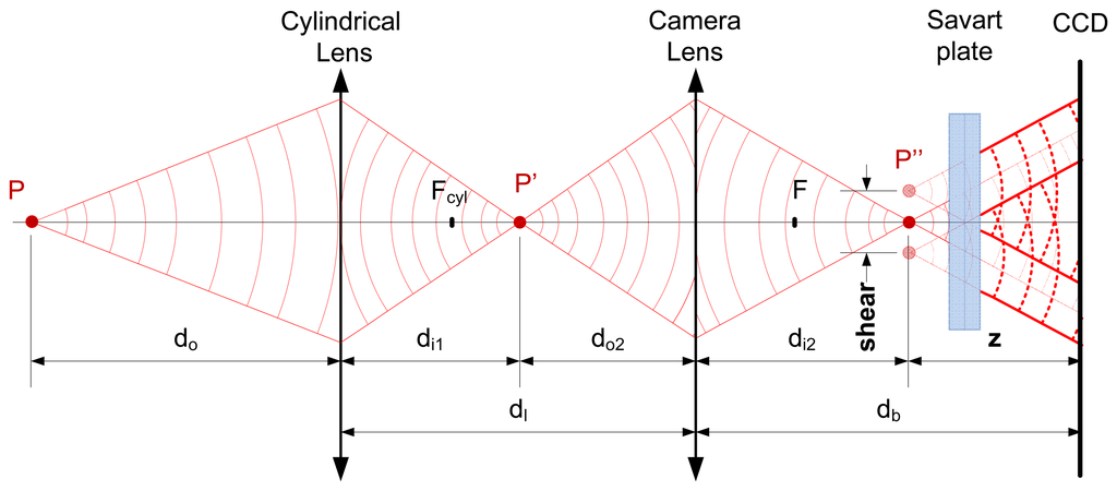 The image formation in the direction perpendicular to the profile (y-axis) is defined by a two-lens system, as shown in Figure 2. The cylindrical lens generates an image of the light reflecting point P at P′ and the camera lens produces a second image of this point at P″, which is located at a distance z from the CCD. The wavefront is then duplicated with a lateral displacement (or shear) by the Savart plate, as if originated by two sources shown as the two red points at P″. Both wavefronts interfere in the CCD creating a pattern from which it is possible to calculate the distance z, and ultimately the distance do.