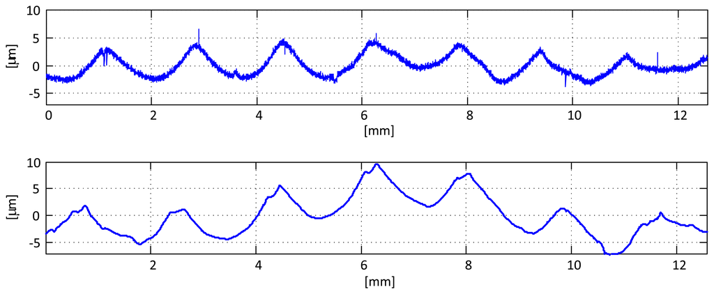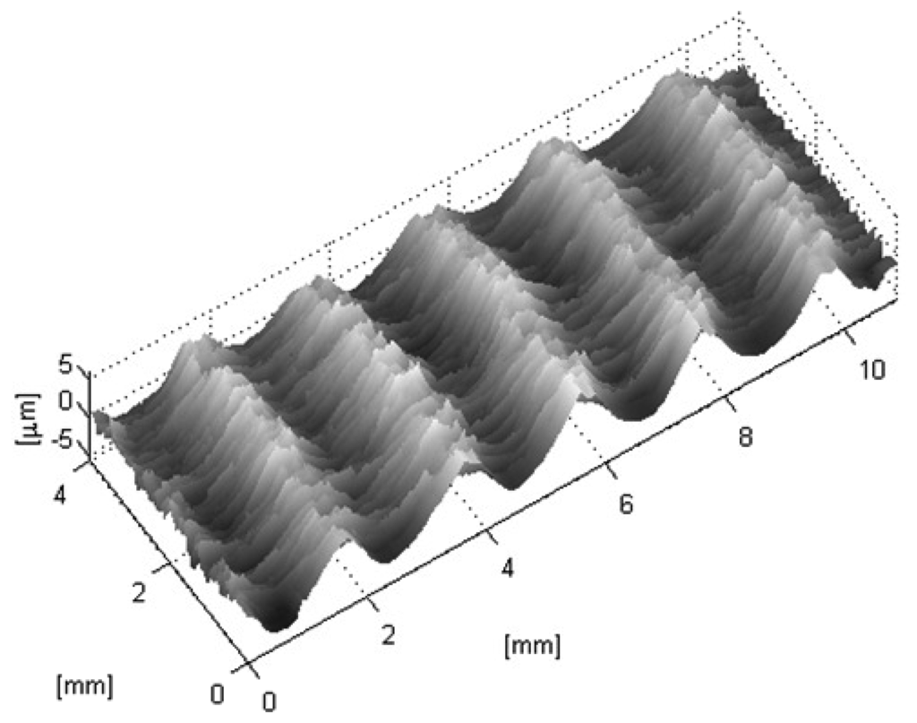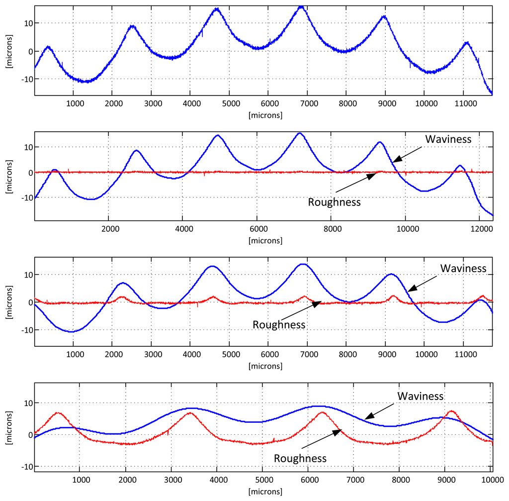 Compared with roughness, waviness relates to the more widely spaced variations of the surface texture and is a key parameter in the quality of the final product. Waviness determines its resistance and lifespan, as well as the distribution of lubricant along its surface [5,6] or heat transfer properties [7]. Evaluating the waviness of a surface is also more challenging than evaluating roughness, as it requires the same depth precision in the measurements, but along much longer profiles (typically between 4 and 12.5 mm).