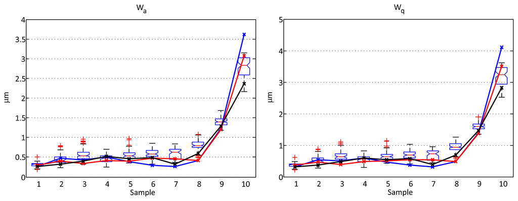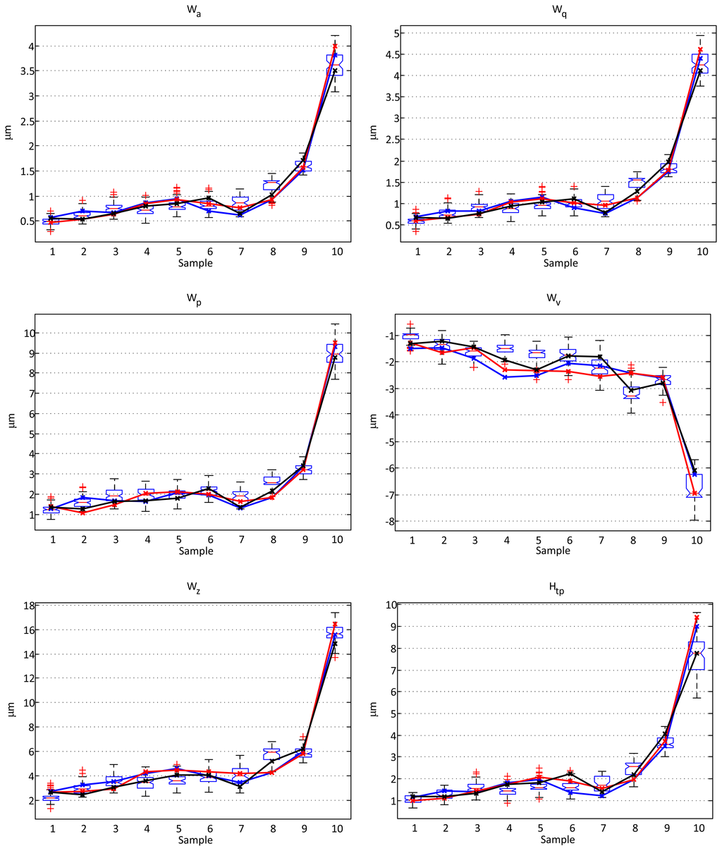 In every case the raw profile was first filtered with a cubic fit to remove the form. Then a Gaussian filter was used to extract the waviness profiles. Two different cutoff wavelengths were used: 0.25 and 0.8 mm. Finally, the main parameters were calculated for all the profiles. Though it is quite common to suppose normal distribution of the value of the parameters for different profiles of the same sample, the non-parametric boxplot method is used for comparison, without making any assumptions of the underlying statistical distribution. The values calculated over the profiles obtained with the stylus are used as references and plotted using a solid line superimposed to the boxplot. Figures 7 and 8 show the comparative results.