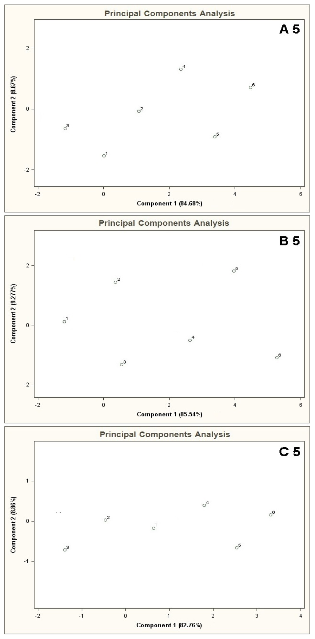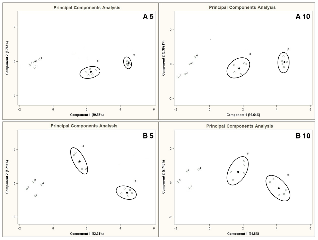 Figure 10 illustrates the PCA results for the mixtures A 5, B 5, A 10, B 10, presenting all results of analyses for the mixtures 5 and 6. Black points 5 and 6 marked on the PC planes are the averaged results from five measurements. It can be seen that the region of PC plane attributed to the mixture 5 is distinguishable from the region where the points representing the mixture 6 are. Such a separation excludes relatively any high correlation between them (presence of information redundancy), which in turn is observed for the remaining points 1–4 (lack of clear separation of points).