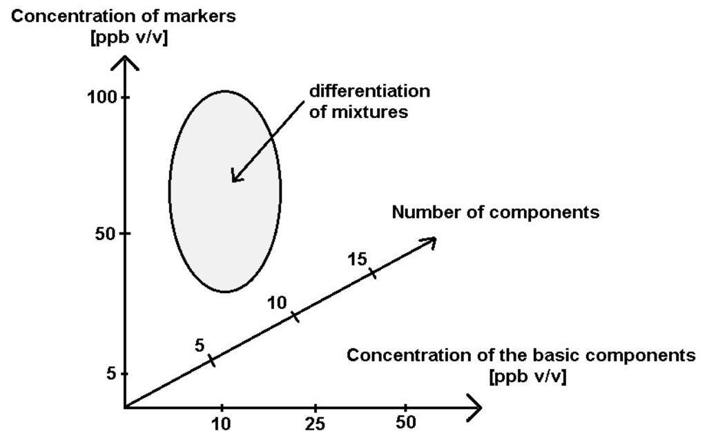 The investigations revealed a possibility of differentiation between the mixtures with the COPD markers in the case when a number of the basic components was 5 and 10, when their concentration was at the level 10 ppb and 25 ppb v/v, and when the concentration of the markers in these mixtures was at the level 50 ppb and 100 ppb v/v. It was confirmed by the cluster analysis performed using the sphere method. Higher concentrations of the basic components in the mixtures and increased number of these components made it impossible to differentiate between the mixtures 1–6. The electronic nose device proved its usefulness only when the concentration of the COPD markers was at least two times higher than the concentration of the mixtures and only for limited number of the basic components. These conclusions are illustrated in Figure 12.