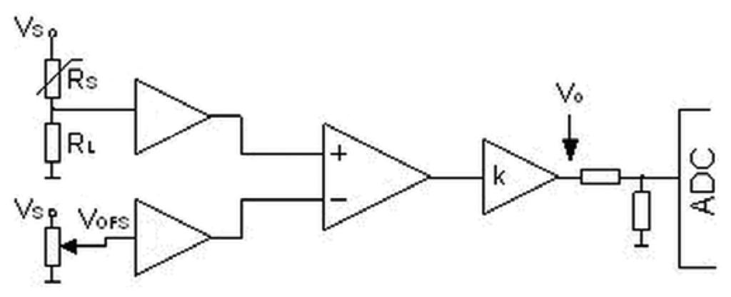 The prototype of the electronic nose was built from six commercial, semiconductor sensors (TGS 880, TGS 825, TGS 826, TGS 822, TGS 2610, TGS 2602 by Figaro Co.). All internal parts of the prototype: scrubber, connecting tubes and module with the sensors were in a thermostatic casing in order to provide stable measurement conditions. The temperature was maintained at 36.6 ± 0.3 °C. Relative humidity of air inside the module with the sensors was 90 ± 1%. A conversion of the sensors' output signals to digital signals was accomplished via a dedicated miniaturized integrated circuit. This circuit (Figure 2) consisted of a sensor of resistance Rs (operating within a voltage divider Vs = 5 V), termination resistance selected for each sensor RL, amplifying course with adjustable amplification k and zero system with adjustable voltage offset VOFS. The aim of the circuit was to convert changes of sensor resistance into voltage signal measurable by an analogue-to-digital converter (ADC).