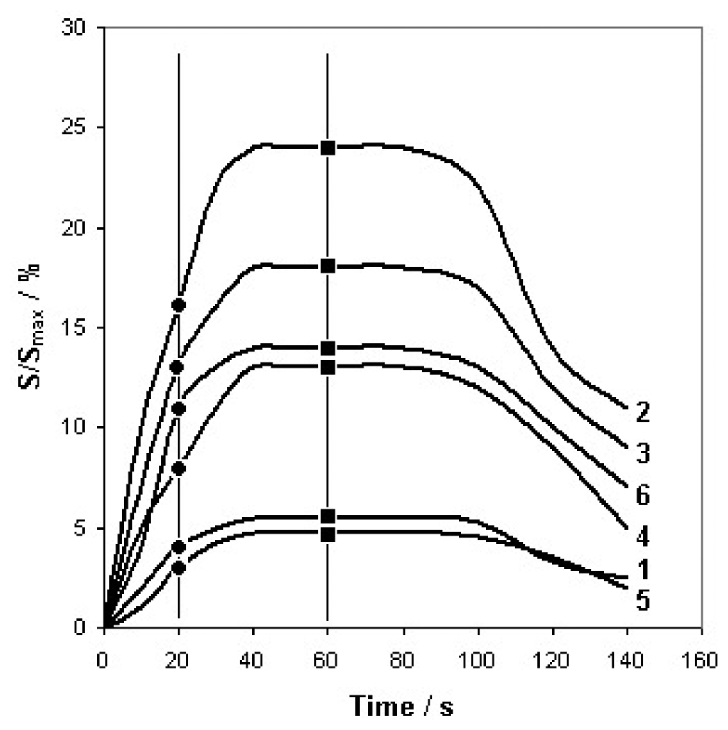 The parameters Q and t were optimized in order to obtain maximum and constant sensors response time. Volumetric flow rate was 5 dm3/h and time of barbotage (single analysis) was equal 1 min. Additionally, the results of PCA of the sensor signals after 20 s were presented in order to verify the optimization method adopted. Figure 3 presents dependence between the signal of six sensors and time of barbotage (A 5 type mixture) with the time instants, at which the PCA was performed.
