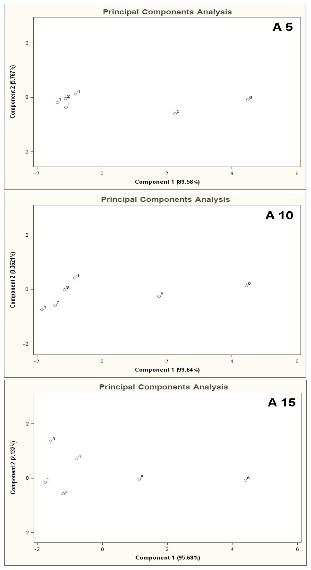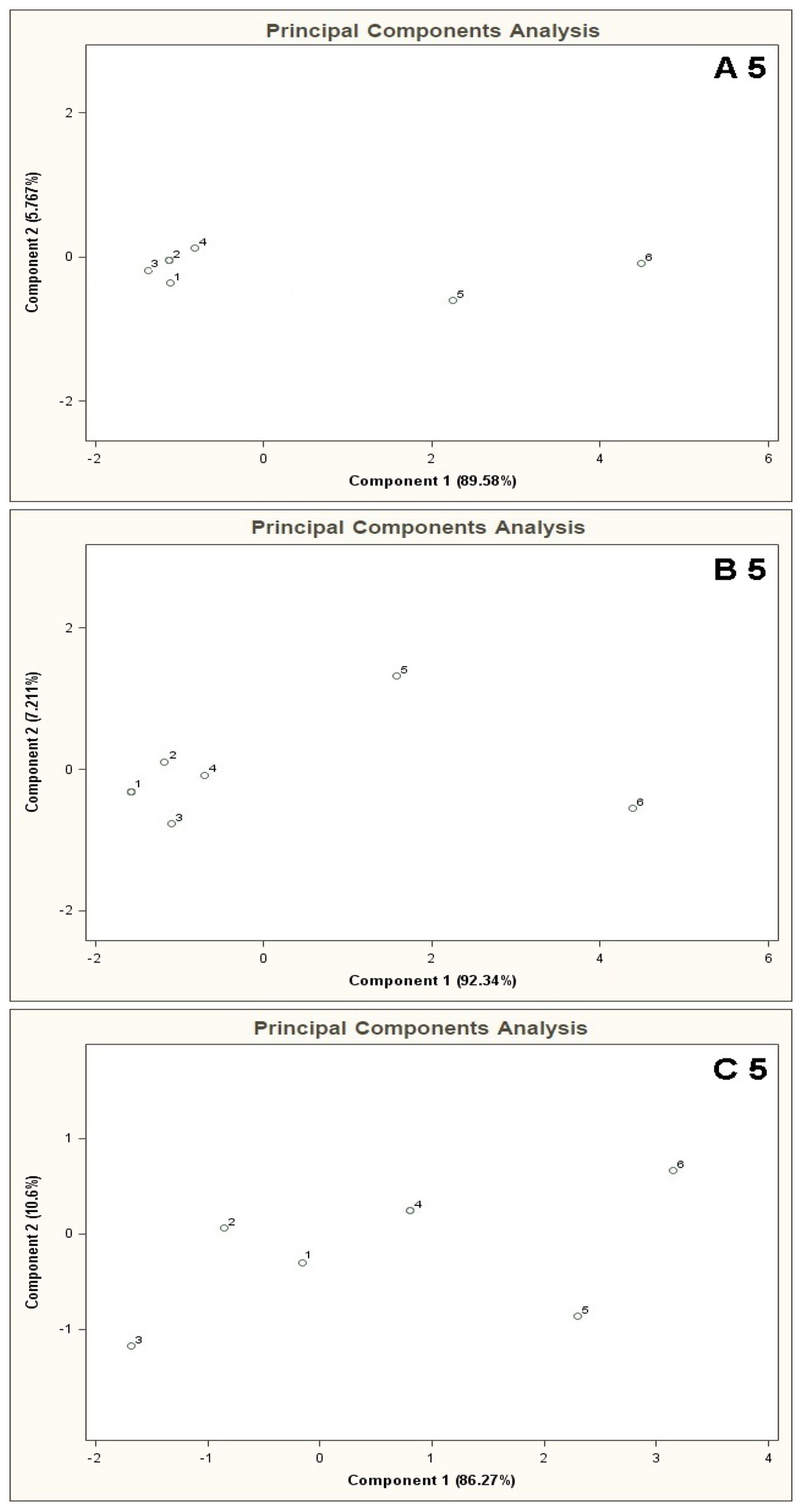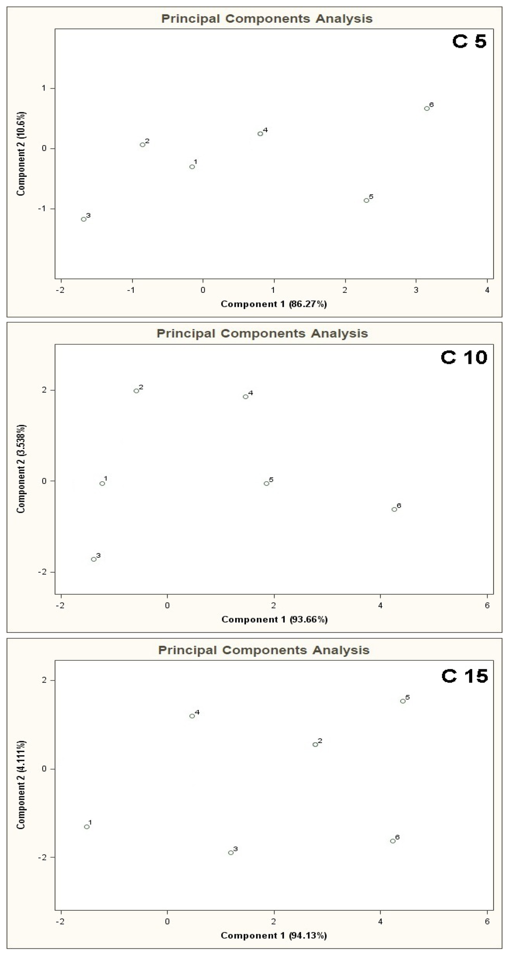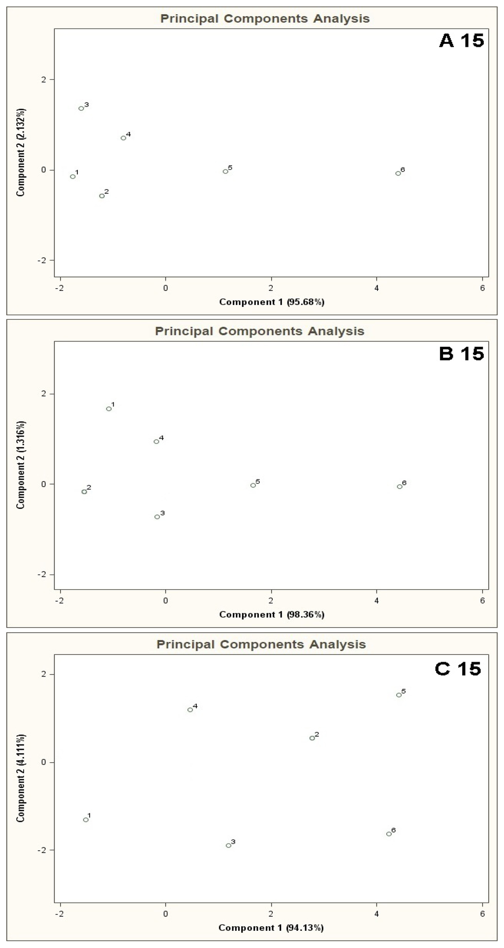 Figure 6 shows PCA results for the mixtures of type A 15, B 15, C 15. The result of A 15 analysis makes it possible to identify mixture 6 only. The distance between the point 6 and the point 1 is much bigger (more than two times) the distances between the point 1 and the remaining points. In the case of B 15 analysis differentiation between the mixture 6 and the remaining ones is burdened with relatively high uncertainty. The distance from the point 1 to the point 6 is ca. one and a half times bigger than the distance between the points 1 and 5 (the point 5 is in a vicinity of the points 1–4 and is the closest to the point 6). The cluster analysis does not confirm the presence of two clusters for A 15 type mixture, however it is convergent with the information obtained via PCA of the mixtures of type B 15 and C 15 where existence of only one cluster was discovered, which made it impossible to differentiate between the mixtures 1-6 (information contained in Table 2).