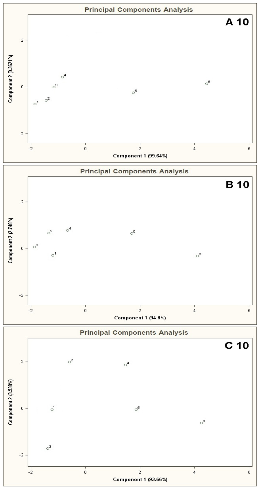 The results of cluster analysis performed with the sphere method are convergent with the observation of the PCA planes and distribution of the points 1–6 over these planes. Figure 5 illustrates PCA results for the mixtures of type A 10, B 10, C 10. In this case one can also notice that the results of A 10 and B 10 analyses differ from the C 10 analysis result. The points 1–4 for A 10 and B 10 analyses are clustered around each other and very distant from the points 5 and 6. It means that when the concentration of the COPD markers is higher than the concentration of the basic components differentiation between the mixtures is possible. No influence of the number of basic components on analysis results was observed (there was similarity between the A 5-A 10 results, as well as between B 5 and B 10). In the case of C 10 analysis differentiation of the mixtures with various concentrations of the COPD markers was not possible. Point 5 lies within similar distance from the point 1 (the mixture without the COPD markers) as the points 2, 3, 4. It makes differentiation between the mixture 5 and the mixtures 1–4 impossible. A ratio of the distance between the point 1 and the points 2–5 to the distance between the point 1 and the point 6 is close to unity. It means high uncertainty of differentiation between the mixture 6 and the remaining ones. The cluster analysis (results in Table 2) confirms presence of two clusters for the mixtures of type A 10 and B 10, which contain the objects representing the mixtures 1–4 and the mixtures 5 and 6. In the case of C 10 type mixture the calculations reveal presence of one cluster only corresponding to the entire mixture 1–6.