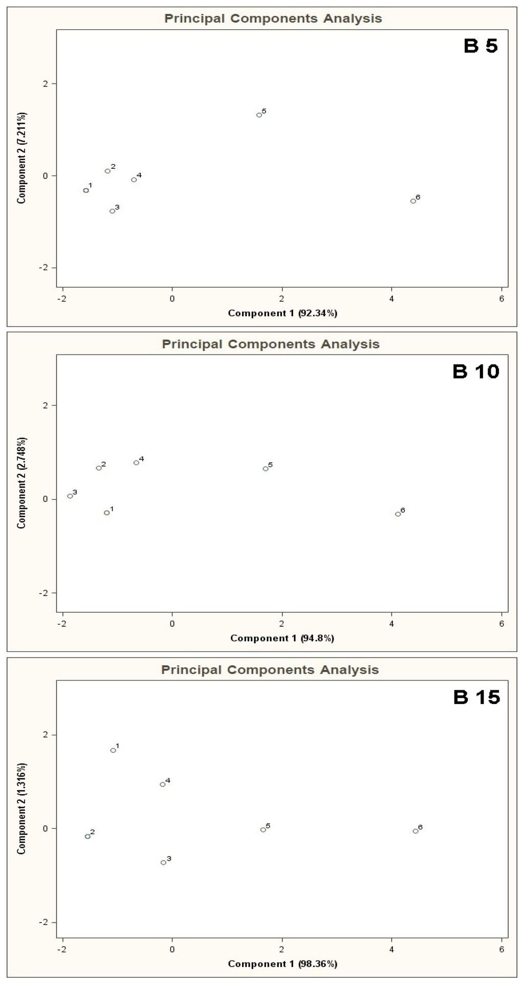 PCA results for the mixtures of type B 5, B 10, B 15 are illustrated in Figure 8. The results of these analyses are characterized by close similarity to the results presented in Figure 7, where increased number of the basic components deteriorates differentiation of the mixtures 5, 6 from the mixtures 1–4.