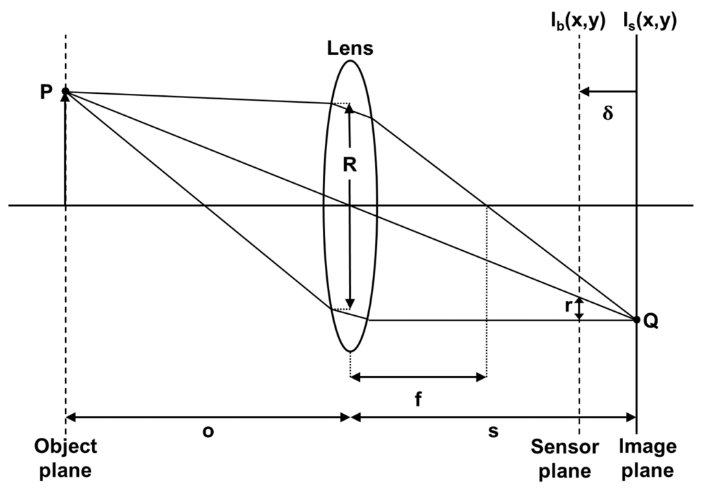 Each point of the object is projected onto the image plane at a single point and leads to the formation of the image Is(x, y). If the image plane does not merge with the sensor plane, where the distance between them is δ, the energy received from the object by the lens is distributed on the sensor plane in a circular shape. However, the shape of this energy distribution depends on the shape of the diaphragm aperture, considered circular. The radius of this shape can be calculated by: