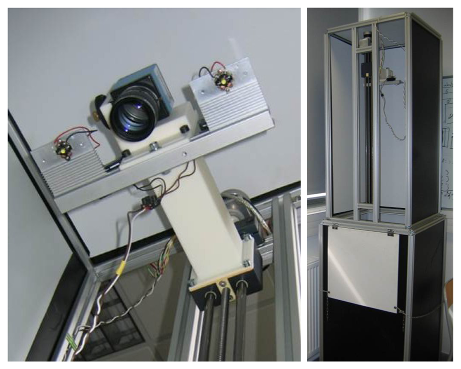 In order to perform displacement of the optical unit, we use the system of Figure 2. The optical unit is centered on the desired field of view and two power LEDs are used to illuminate the scene. A stepper motor is coupled to a linear displacement with trapezoid screw and allows moving the optical unit incrementally and precisely. The motor control is carried out by a micro-controller associated with a power card. Both this card and the LEDs are powered by a 12 V battery with a 12 V/5 V supply for the micro-controller card. The acquisition system is transportable and self-powered, which allows acquisitions in the field. The camera and the micro-controller are both connected to a rugged computer via USB and controlled by an interface coded in C++.