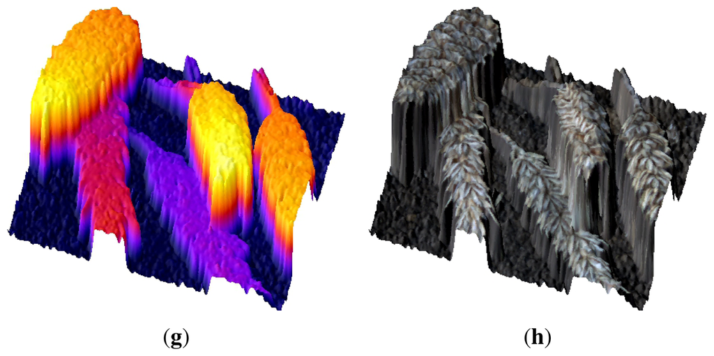 When a focus value is assigned to each pixel of all the images, these results are used to obtain the depth information. Indeed, a curve is obtained for each point of the scene. Then, we estimate the maximum of this curve to determine in which image the point is the sharpest. Once this is performed for all the points, we associate a gray level to each point according to the sharp position to obtain the depth map (Figure 6). The primary purpose of these depth maps is the association with our previous research based on the automatic counting of wheat ears [24]. Indeed, the depth map allows us to distinguish the objects that are not located on the same spatial plane but overlapped in 2D images. The knowledge of spatial location of each pixel can also eliminate unnecessary information such as the floor of the scene. Thus, we realize a spatial segmentation to improve accuracy and rapidity of our post-processing. Moreover, with the focus measure values, we can create a merged image to retrieve a 2D image from the sequence. The depth map can be used to have a 3D visualization of the scene and the merged image is used to map texture on this 3D visualization. Two examples of these different results can be found in Figure 6.