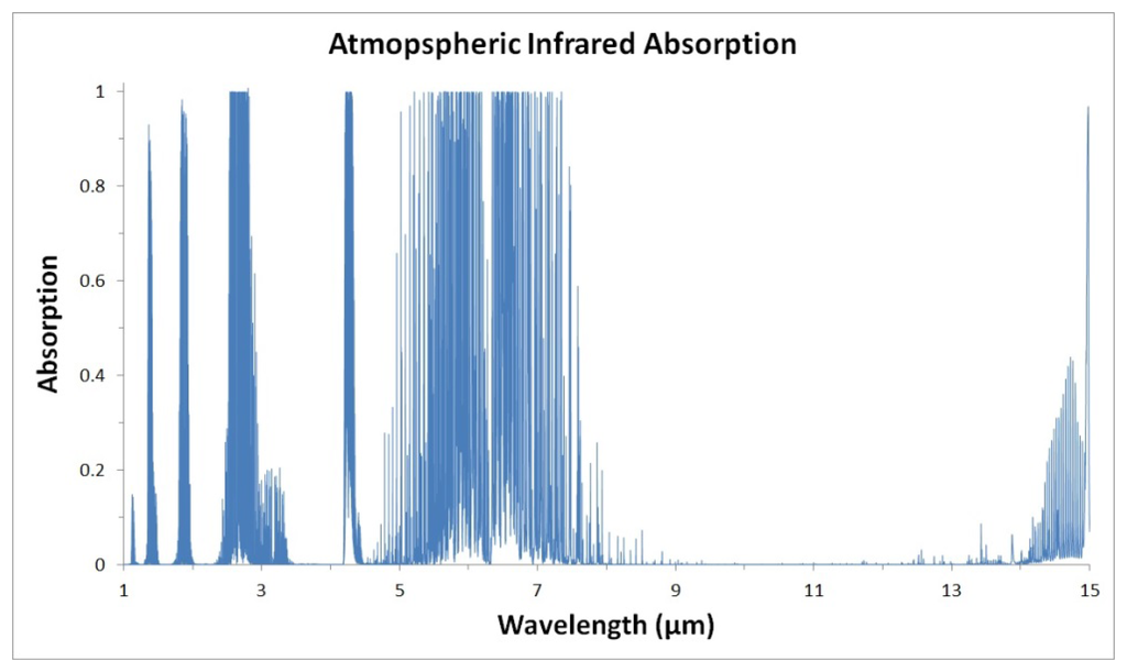One complication for IRPDs is atmospheric absorption. As IR radiation propagates through the atmosphere, some wavelengths are readily absorbed due to the molecules present in the air. Of greatest concern to IR radiation are the absorption spectra of water vapor and various hydrocarbons [], whose absorption spectra cut large infrared windows of the atmospheric transmission spectrum. These infrared windows (seen in Figure 1) do not necessary preclude the use of IRPDs at these wavelengths, but they can significantly interfere with device performance at those wavelengths [,].