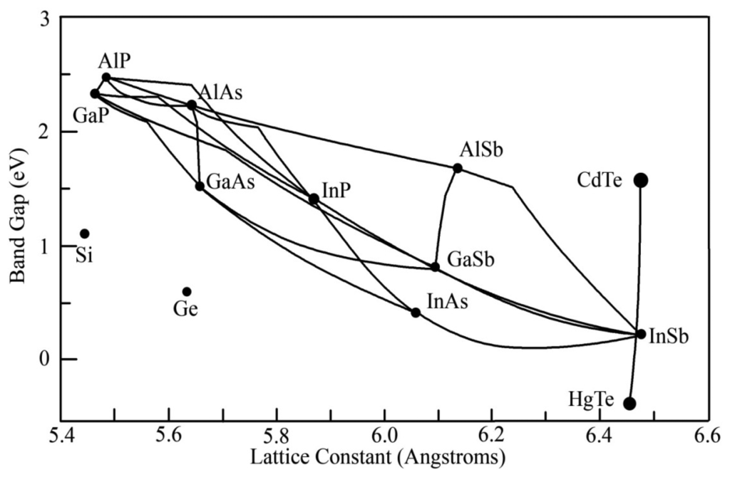 The scope of this research becomes much clearer when examining the strengths and weaknesses of the MCT technology as a whole. Some of its greatest strengths have been touched on already, namely the established history of the technology and the relative simplicity of fabrication compared to a number of the later technologies. There are a number of methods utilized to grow MCT devices, including metalorganic vapor phase epitaxy (MOCVD), liquid phase epitaxy (LPE), and molecular beam epitaxy (MBE), which allows for more flexibility in fabrication [–]. MCT detectors tend to have very high responsivities and competitive detectivities when compared with quantum structures utilized in other technologies []. As MCT is a ternary material, by varying the composition of the material it is possible to span all of the wavelengths between the constituent binary materials, as can be seen in Figure 2. With MCT, this is a large range, spanning all wavelengths between 0.7 μm and 25 μm and three atmospheric windows [,,–]. However, despite the wide range of wavelengths MCT spans, there is very little variation in the value of the lattice constant across that range []. This allows for simplification of many of the enabling techniques used in IRPDs (substrate selection, ROIC usage, etc.) to be used across all MCT compositions. MCT devices also tend to have very short integration times and very low junction capacitances compared to other bulk detectors due their low dielectric constant, both of which enhance its capability to detect fast moving objects [,,].