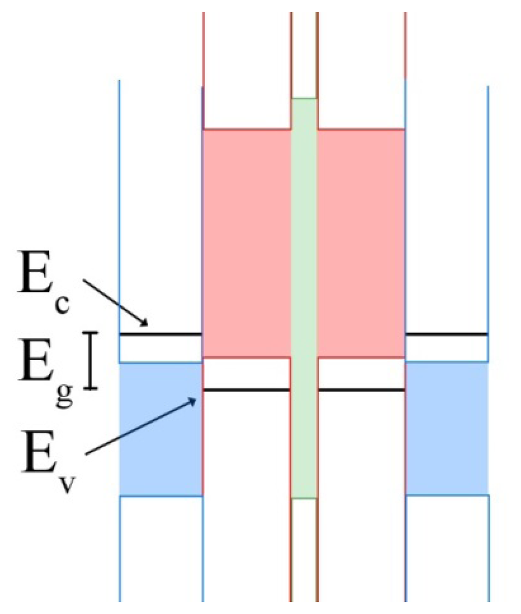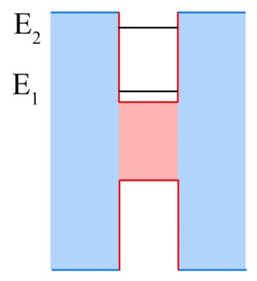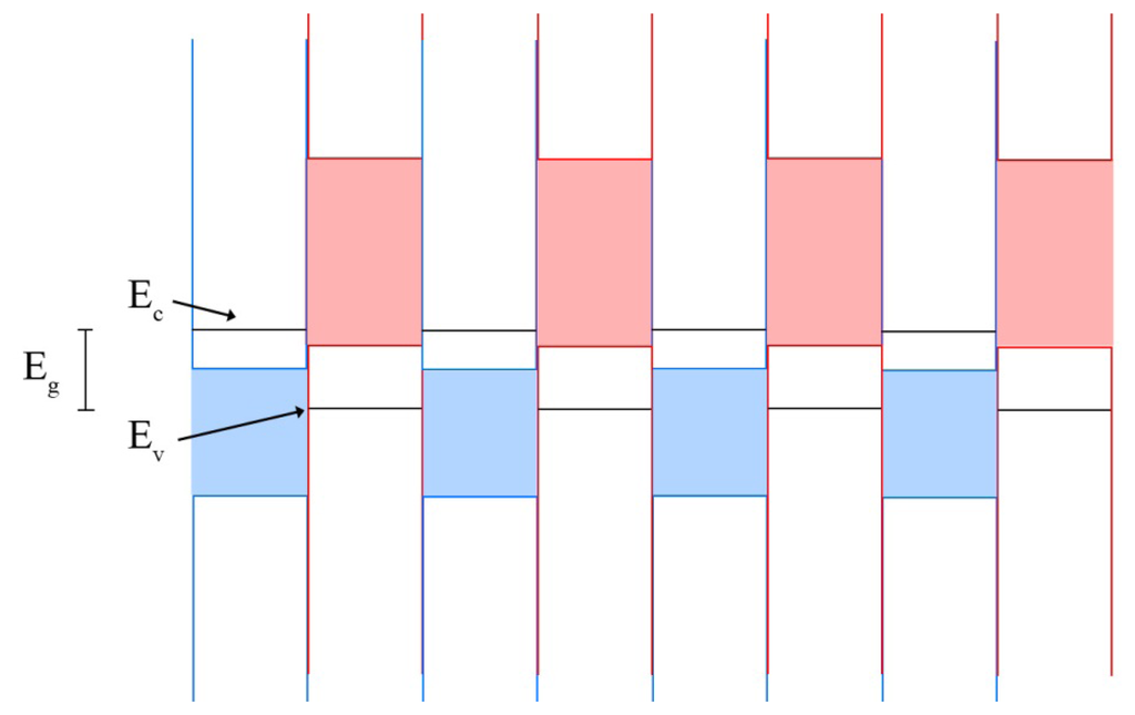 Quantum well infrared photodetectors (QWIPs) operate on a much different principle than the bulk detectors that came before it. First demonstrated in 1987 by Levine et al. [], QWIPs rely on quantum scale physical effects, whereas bulk detectors operate on larger scale effects. QWIPs in their most basic form are a periodic repetition of layers of two materials with dissimilar band gaps. The material with the lower energy band gap is commonly referred to as the well layer, while the higher energy band gap is referred to as the barrier layer. This structure approximates a series of quantum mechanical wells, with the well layer deposited thinly enough (generally on the order of nanometers to tens of nanometers) such that discretized energy states form within the well instead of the typical band of energy states. An example quantum well structure is provided in Figure 3. The energy states within the well will be characterized by Equation (5):
