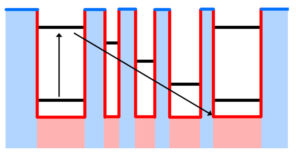 A pair of sub-technologies of SLS spawned due to the implementation of current blocking layers. Each of these technologies incorporates a different manner of a current blocking layer. The first, and arguably more complex, manner was first proposed in 2001, but not implemented until 2006 [,]. This technology incorporates a current blocking layer into one of the active superlattice layers, forming an ABCB superlattice as opposed to the traditional AB superlattice. This barrier layer typically has a significantly larger energy band gap than the surrounding material, leading to the distinctive band structure that gives these devices their name. An example band diagram can be seen in Figure 6.