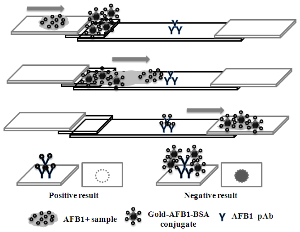 A schematic illustration of the one-dot LFIA is shown in Figure 1. The molecular weight of AFB1 is lower than that of the colloidal gold-AFB1-BSA conjugate, and the rate of AFB1 movement on the membrane is higher than that of the colloidal gold-AFB-BSA conjugate. AFB1-pAb is only able to combine with AFB1 or colloidal gold-AFB1-BSA conjugate. If there is AFB1 in the sample extract, AFB1 is combined faster with AFB1-pAb on the membrane than the colloidal gold-AFB1-BSA conjugate. At this point, the inhibition assay is completed and no red color occurs on the test zone. The positive result is judged by the absence of a one-dot on the membrane. However, if there is no AFB1 in the sample extract, the colloidal gold-AFB1-BSA conjugate combines with AFB1-pAb and the red color of test zone can be detected by visual inspection. The negative result is judged by the presence of one-dot on the membrane.
