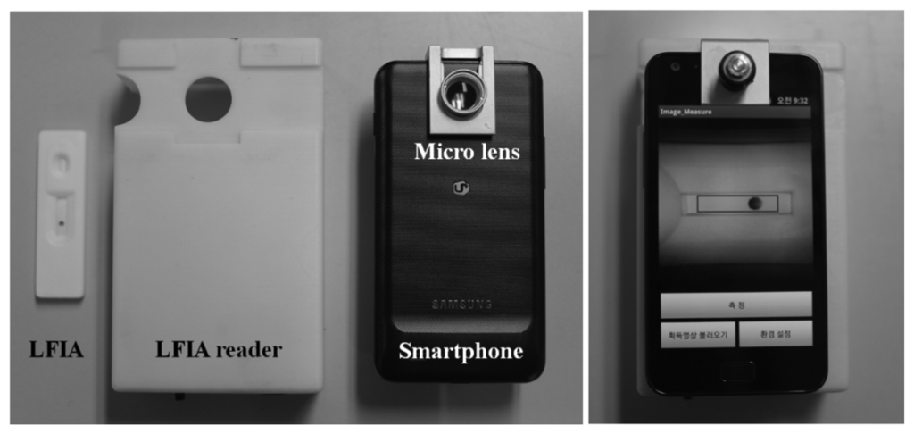 The Smartphone-based reading system consists of a Samsung Galaxy S2 Smartphone, LFIA reader, and Smartphone application, as shown in Figure 2. The LFIA reader is composed of the close-up lens with a 30 mm focal length, white LED light, lithium polymer battery, and main body. The Smartphone application for image acquisition and data analysis was developed on the Android platform.