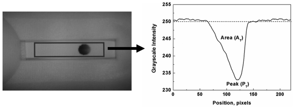 The analysis process of Smartphone-based reading system is as follows. The Smartphone camera was positioned on the close-up lens mounted in the top of LFIA reader. The white LED lights illuminated the detection area of LFIA, and the image of detection area was acquired using the Smartphone camera. The optical density of this image was measured by the Smartphone application, and the peak (PT) and area (AT) value of the test zone on the detection area were calculated as shown in Figure 3.