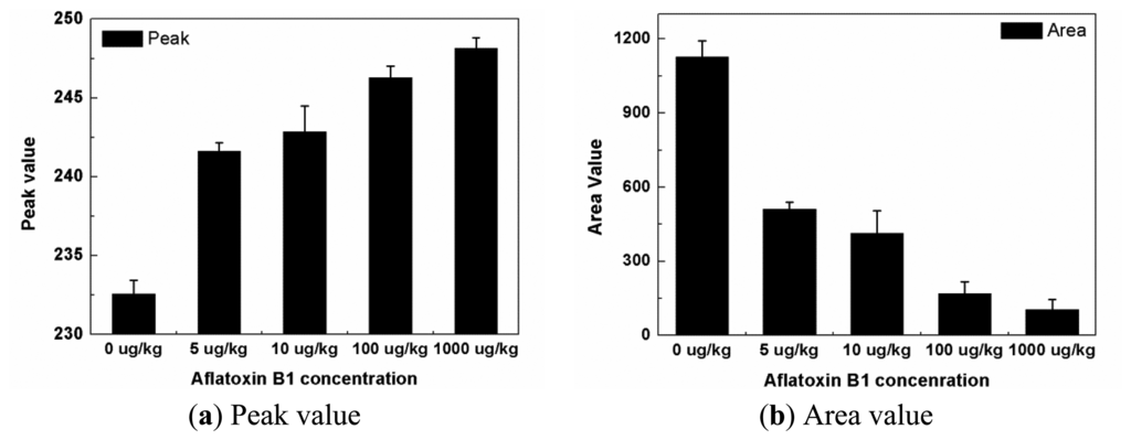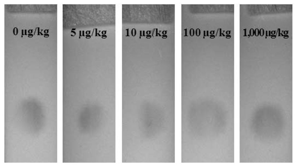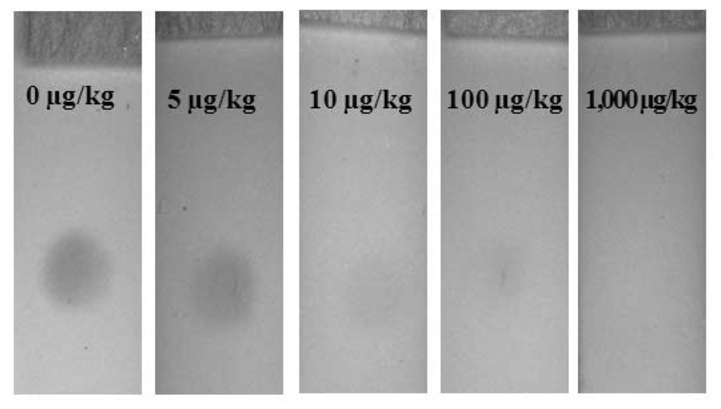 Figure 5(a,b) show the peak and area values measured by the Smartphone-based reading system. In Figure 5(a), the peak value is sharply increased at 5 μg/kg and then increased linearly with the log concentration. On the contrary, the area value is distinctly decreased in the same range and then decreased linearly with log concentrations in Figure 5(b). It is possible to conduct the linear regression analysis in between 5 and 1,000 μg/kg. The correlation coefficients of peak and area values are 0.969 and 0.948, respectively. In Figure 5, we can definitely separate the blank sample from the contaminated sample using the Smartphone-based reading system. The other advantage of this system is represented by the objectivity of the result, which does rely on the subjective interpretation of an operator.