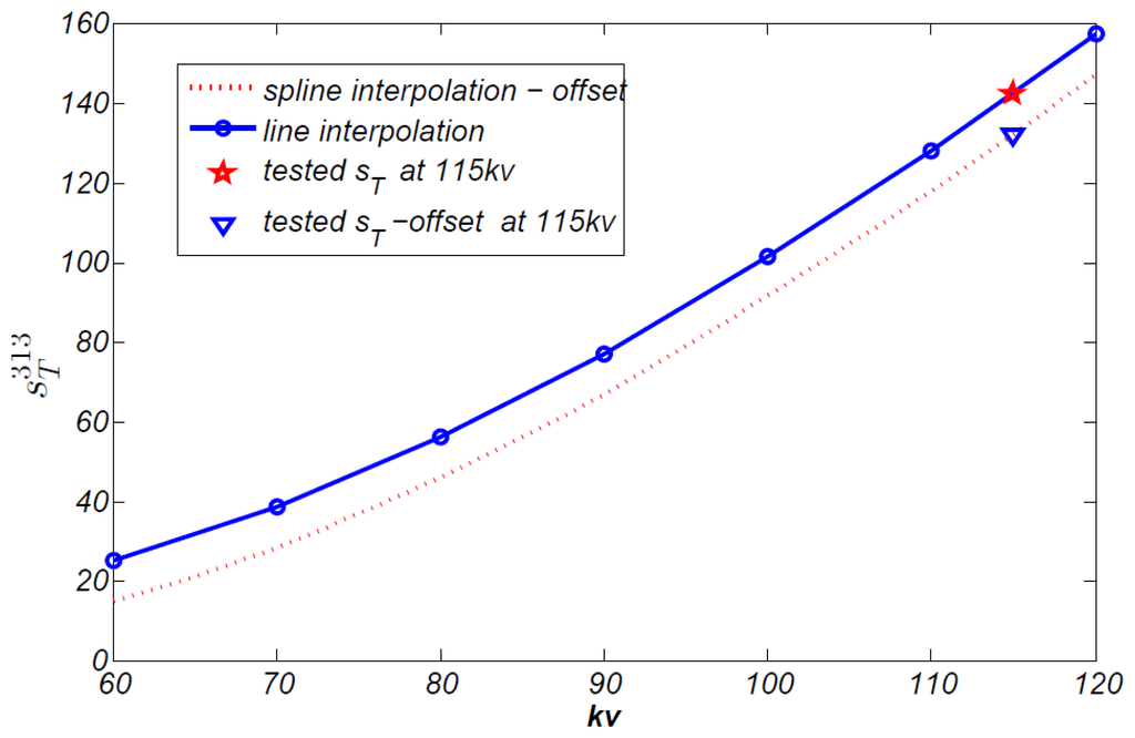 Figure 10 shows one classical sT −Utube line, which belongs to a randomly selected channel 313. Every channel has largely the same shape. We test sensitivity sT at X-ray tube voltage of 60 kV to 120 kV, covering clinical CT voltage range. Sensitivity at other voltage can be got through line or spline interpolation. The spline interpolated value at voltage 115 kV is 142.23 and tested value is 141.92, almost identical.