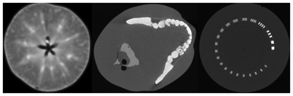 In whole CT detector test environment, we scanned some phantoms, such as an apple, a head phantom and a line pair phantom. The reconstruction method is fan beam FBP algorithm, without data correction. The result is showed in Figure 11. The general inner parts of these phantoms are clearly showed in the image except for some detailed information. Since lack of uniformity correction, circle-like artifacts is rather obvious, especially in apple image and line-pair image. Stripe artifact is conspicuous in head phantom image. Further analysis of image quality is beyond the scope of this article, we will demonstrate more analysis and result in the future articles.