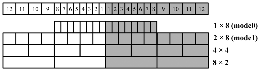 The proposed detector unit supports variable pixel size with several readout modes and Figure 3 shows four of such modes. As shown in the figure, the detector outputs the 16 small pixel segments in the middle in mode 0, while in other mode, specific photodiode pixels are combined together as one readout segment. For example, in mode 1, every two small pixels in the middle are combined as one large pixel, together with the eight large pixels on the two sides, the detector outputs 16 large pixel segments. The detector also supports a float mode which disconnects the PDA from the mDAS, which is intended for test purposes. It is worthwhile to note that although the PDA is organized as a 24 × 24 array, a maximum of 16 segment outputs along the channels are supported so that the detector unit has a maximum of 384 channel outputs, such as in the mode 0 and mode 1.