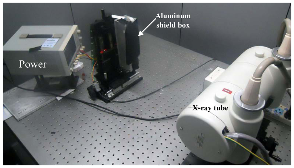 The performance of the proposed detector unit was characterized at both the unit level and the system level. All the experiments were conducted in a lead-shielded and light tight room. Figure 4 shows the test setup using a single detector unit. The detector unit was placed in an aluminum box which acts as the shield for the detector unit. The lid of the aluminum box was removed for minimum attenuation of the irradiating X-ray photons. In order to make a dark environment for the detector unit, the aluminum box opening was sealed with black light-tight tapes. The aluminum box was mounted on a moving stage for vertical alignment of the detector unit to the focal spot of the X-ray tube (model G297 from Varian). An Indico 100 X-ray generator from CPI was used to control the generation of X-ray photons during the tests. In order to read out data from the detector unit, a custom designed circuit board was made which converts the data output from the detector unit into RS232 protocol and transfers the data to a host PC, and a MATLAB GUI tool was developed on the host PC to receive data from the detector unit and store as files for further analysis.