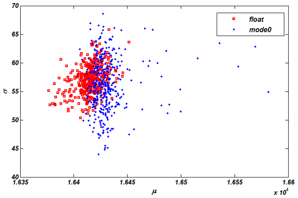 Figure 6 shows the noise level of each pixel by calculating σ and μ in Equation (2). During the calculation, na was set to 60 for integration time 500 us, which was obtained from the manufacturer. Each point in the figure stands for a channel. Squares are channels tested in float mode, whereas the dots are channels tested in mode 0. These results show that the noise level in mode 0 and float mode meet the requirement since maximum standard variance max σˆ is under 70 and most of dots and squares concentrate near σ =55 In addition, mode 0's dots are dispersed wider in axis σ compared with that of float mode because of the introduction of PDA noise np Furthermore, an obvious offset effect is introduced in axis μ Obviously, the dominating noise source is na.