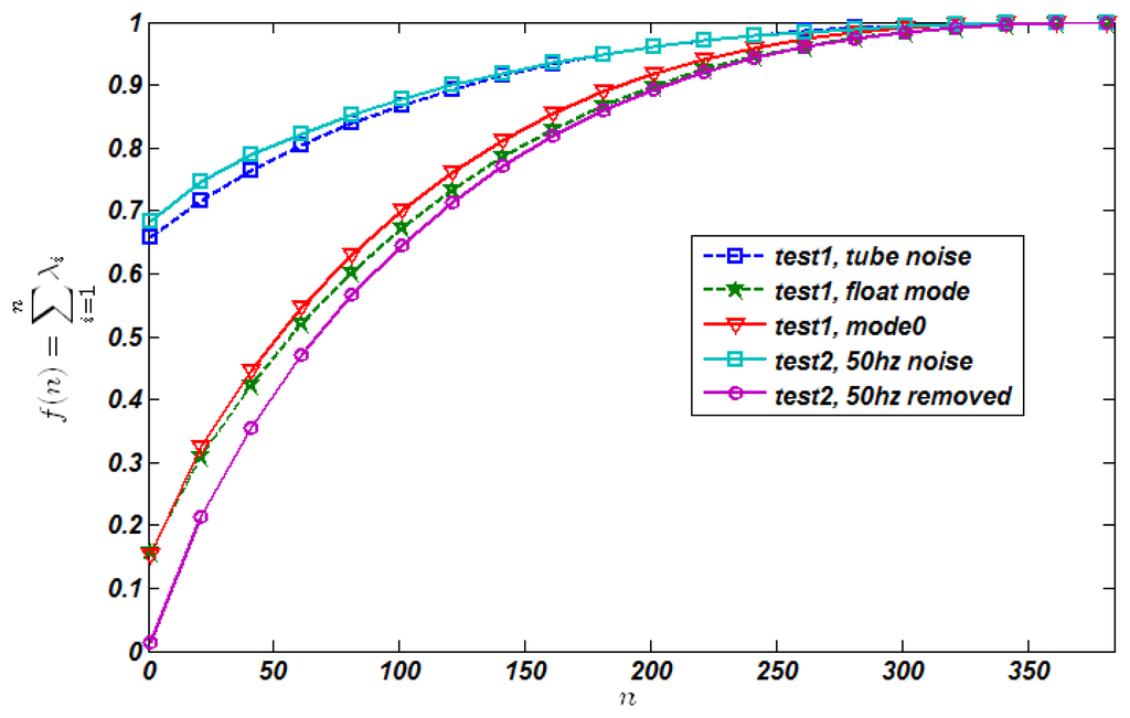 Figure 7 shows the PCA accumulative curves for single unit tests (test 1) and CT detector test (test 2) respectively. Generally, upper accumulative curve's independence is poorer compared with the lower one. For example, the line of test1, float mode is lower than that of test1, mode 0 since the introduction of np to the latter, impairing the independence quality. Another phenomenon illustrates this property clearly is that when we removed the 50 Hz power noise from the raw data in test2, its accumulative line dropped dramatically, which is showed in Figure 7. The rationale of this phenomenon is that power noise acts as a common noise source which affects each channel simultaneously, in another word, channels are highly dependent. In order to further explain the utility of this method, we introduced another common noise source—X-ray tube noise ntube Usually ntube is significantly more conspicuous than that of na+ np + nc so that we can ignore the effects of the later when X-ray tube is turned on. In Figure 7, the ntube curve is also rather high, accord with our analysis and expectation.