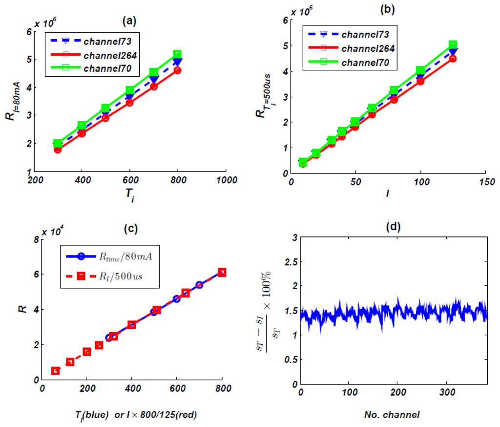 In order to check the linearity of response of the detector unit, we randomly choose three channels and test its R∼T and R ∼ Itube line, T is integration time, Itube is tube current and R is the response. Figure 8 (a,b) shows R∼T and R ∼ Itube line respectively, which exhibit rather linear responses. Figure 8(c) shows channel 73's sensitivity that was got using the 2 different methods described in Section 2.3.3. The blue solid line's slope stands for sI and the red line stands for sT. Just as we have expected, they are almost the same. Figure 8(d) shows relative difference between sI and sT of each channel, the maximum difference is 1.67%.