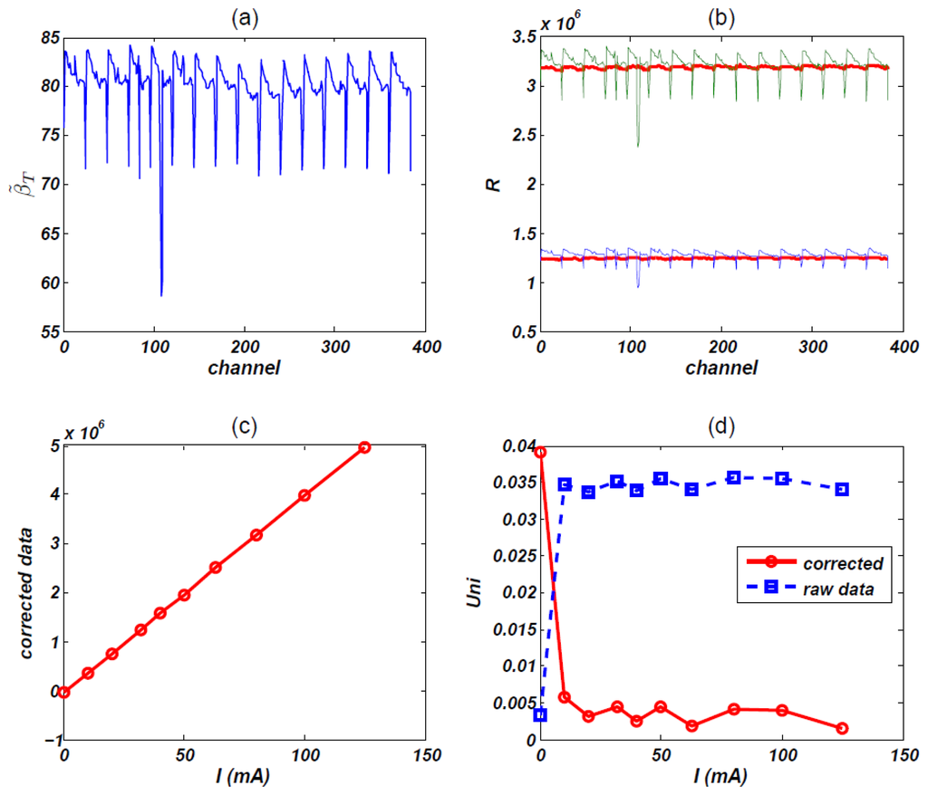 Finally, we show the a contrast of uniformity Uni, which was defined in Equation (7). For almost all response, the corrected result has better uniformity. For the zero input, however, the uniformity is undermined by the correction procedure, this is because raw data of zero input's uniformity is quite well, just as we have analyzed in noise level experiments.