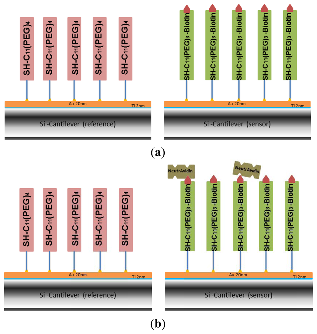 The gold-coated cantilever array was first functionalized with undecanethiol, containing three ethylene glycol units and a biotin group (SH-C11-(PEG)3-biotin) by using microcapillaries filled with a 50 μM solution of SH-C11-(PEG)3-biotin in ethanol for 30 min (shown in green in Figure 1(a)). Since only differential measurements provide reliable results [19], some of the cantilevers have been functionalized as reference cantilevers by self-assembly of a SH-C11-(PEG)4 monolayer (shown in pink in Figure 1(a)), which is inert to NeutrAvidin in subsequent immobilization. The array was rinsed with absolute ethanol and Nanopure water and stored at +4 °C in PBS. In this work, several pre-functionalized arrays were also stored in argon at +4 °C for evaluation of optimized storage conditions.
