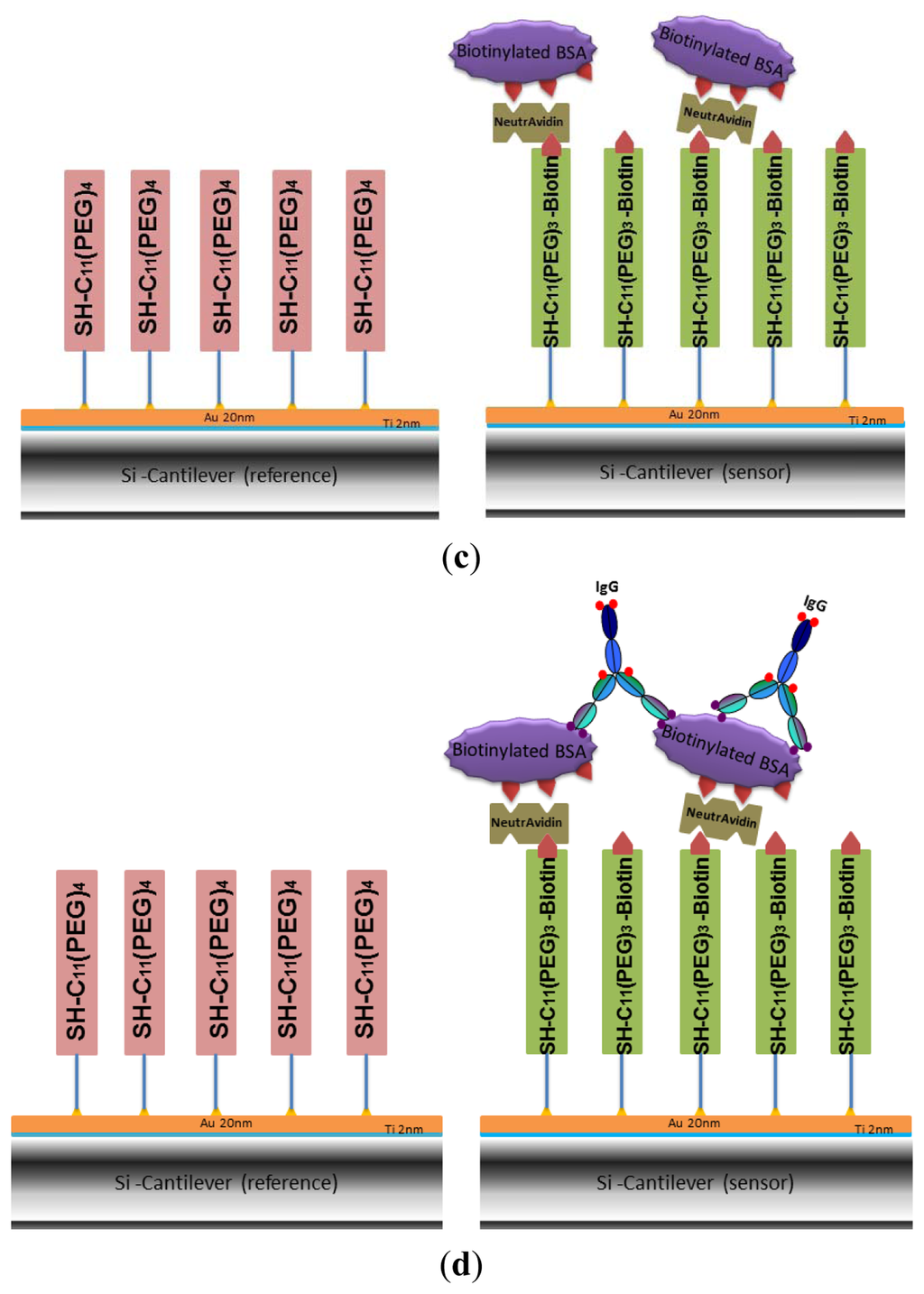 The biotin-NeutrAvidin interaction [14] is one of the most widely used coupling mechanisms in bioconjugation chemistry. NeutrAvidin is a tetrameric protein with each subunit being capable of binding one molecule of biotin. Due to the strong binding affinity and high specificity of the interaction, NeutrAvidin is used as a transduction layer in a multilayer system to mediae between the biotin-coated surface and the biotinylated receptors, such as biotinylated BSA. Based on the biotin-NeutrAvidin interaction, we have developed a multilayer biosensor utilizing a layer of biotin-terminated poly-ethyleneglycol (PEG) undecanethiol molecules that is known to reduce non-specific binding of proteins [15]. We have studied the shelf life stability of biotin/PEG-functionalized cantilever arrays by adsorption of NeutrAvidin. The results indicate that the surface can be kept in PBS buffer for over 40 days without a major loss in sensitivity compared to freshly prepared sensors. Further, we have coupled biotinylated BSA to the NeutrAvidin/biotin/PEG-layer and measured the binding of monoclonal mouse IgG antibodies (m-IgG) and polyclonal sheep IgG antibodies (s-IgG). The average binding signals of 6.0 ± 1.0 × 10−3 N/m and 5.3 ± 0.4 × 10−3 N/m for BSA/m-IgG and BSA/s-IgG respectively showed no significant difference. The findings underline the high reproducibility of the multilayer format cantilever sensor for antibody detection. The results obtained allow provision of well-tested protocols and measurement kits for reliable and reproducible cantilever sensing experiments on a variety of consumer-modifiable chemical platforms.