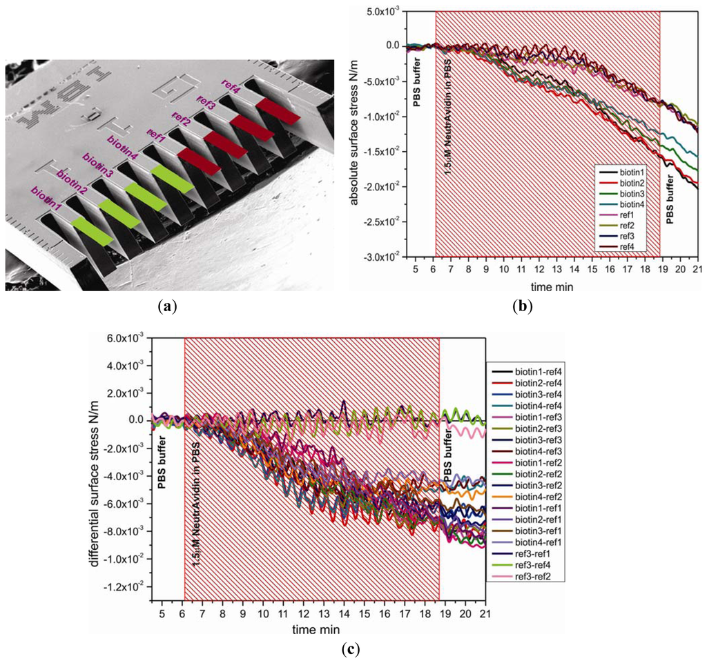 To study the functionality and stability of the SH-C11-(PEG)3-biotin layer on cantilevers, a 1.5 μM solution of NeutrAvidin in PBS was directly injected into the measurement cell of the cantilever device. Figure 2(b) shows the absolute responses to injection of NeutrAvidin, which are divided into two groups, the sensor group and the reference group. The absolute surface stress of sensor cantilever group for specific binding of biotin and NeutrAvidin was observed to produce more downward bending than for reference cantilever group, demonstrating that immobilization of NeutrAvidin onto SH-C11-(PEG)3-biotin layers was efficient. The differential measurement between sensor cantilevers (biotin1, 2, 3, and 4) and reference cantilevers (ref1, 2, 3, and 4) displayed in Figure 2(a) clearly shows the generation of compressive surface stress of around −6.4 ± 0.5 × 10−3 N/m associated with the binding of NeutrAvidin to SH-C11-(PEG)3-biotin. The magnitudes of the signals are very similar, shown e.g., for the twelve pairs of reference and sensor cantilevers displayed in Figure 2(c). As expected, the difference between three pairs of reference cantilevers produces no signal.