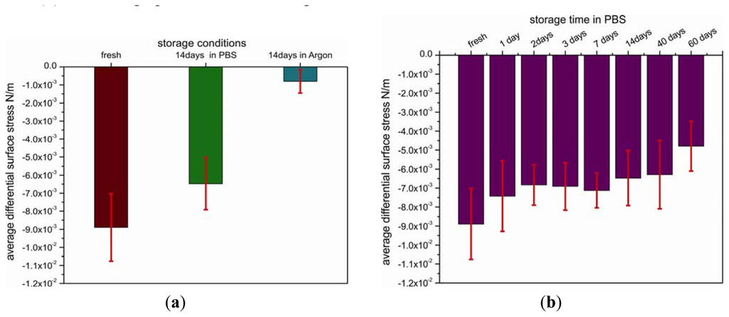 Differential surface stress signals from cantilever arrays stored for 14 days and others tested immediately after coating with a biotin layer are very distinct. The lowest signal of about −0.8 ± 0.6 × 10−3 N/m corresponding to compressive surface stress was observed for the cantilever array pre-functionalized with biotin that was stored in argon for 14 days, yielding only 11% of the value (−8.9 ± 1.8 × 10−3 N/m) obtained on the freshly coated array. In contrast, by storage in PBS buffer instead of argon for 14 days, the signal is only reduced to 73%.
