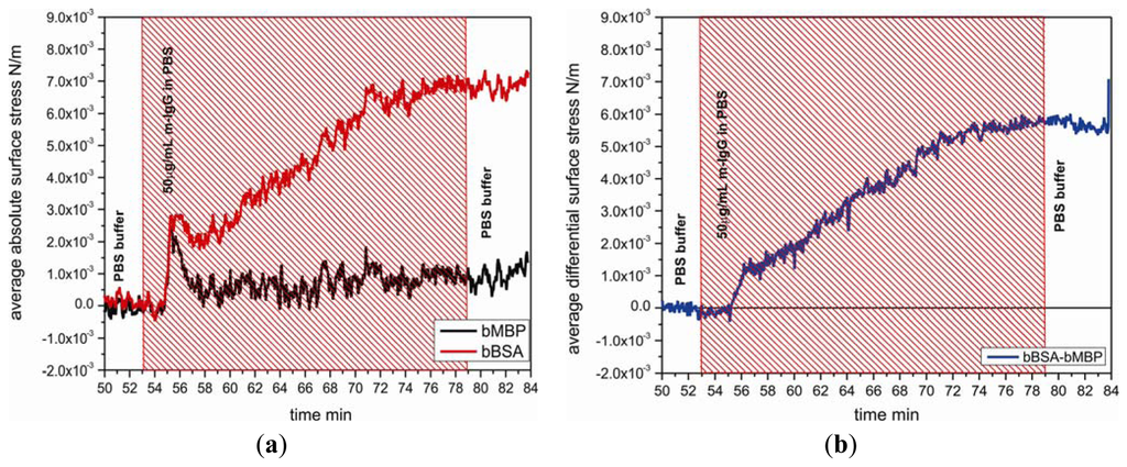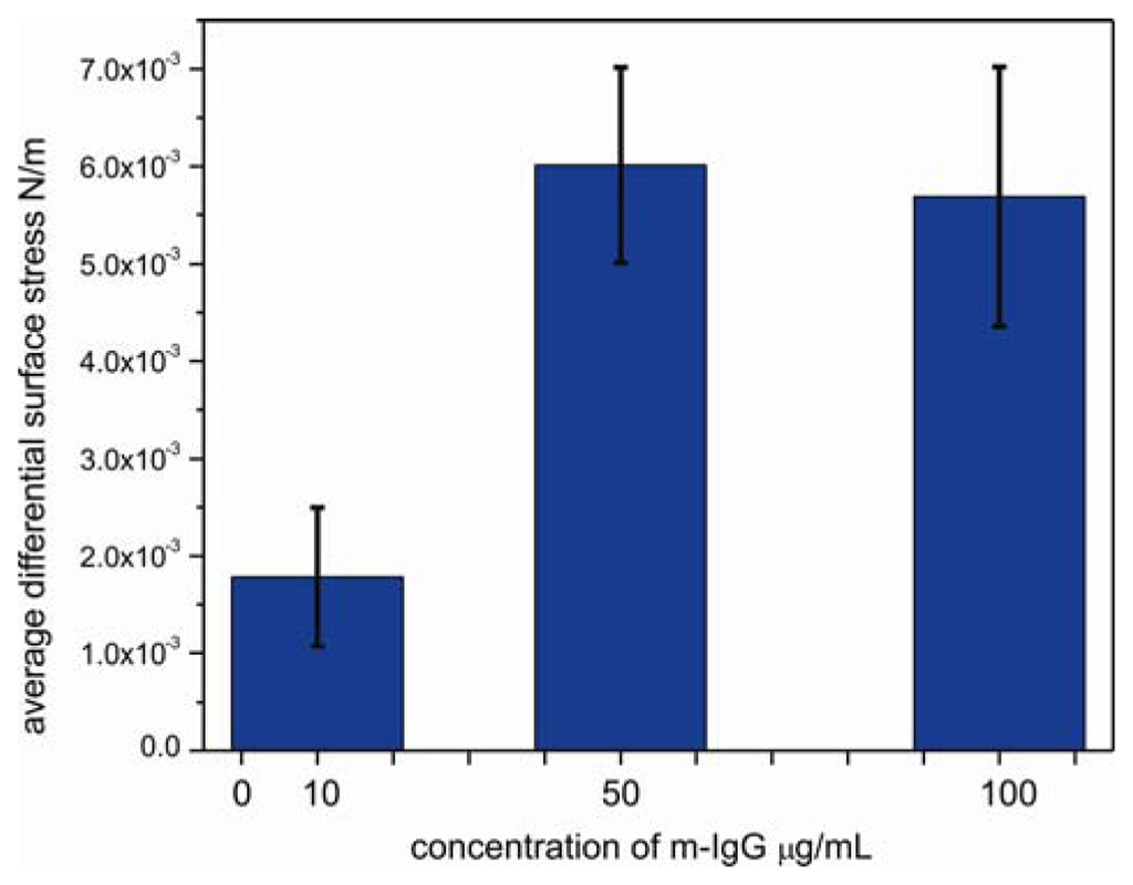To determine the sensitivity of sensor cantilever to antibody, the responses of bBSA cantilevers were tested by performing the experiments at the lowest reported detectable concentration [22] of 10 μg/mL, at an intermediate concentration of 50 μg/mL and at a high concentration of 100 μg/mL of m-IgG (Figure 5). The surface stress of bBSA to m-IgG obtained at low concentration is considerably smaller than at the intermediate concentration of 50 μg/mL. When the cantilever was exposed to 10μg/mL, the differential response was observed to be 1.7 × 10−3 N/m; at 50 μg/mL, the binding between bBSA and m-IgG leads to a considerable increase in the signal to a value of 5.7 × 10−3 N/m. However, upon injecting 100 μg/mL of m-IgG, the bending signal is unchanged (5.5 × 10−3 N/m), suggesting that the surface of the cantilever was saturated above concentrations of 50 μg/mL. The small change in bending signal might be associated with a conformational rearrangement of bound antibody.