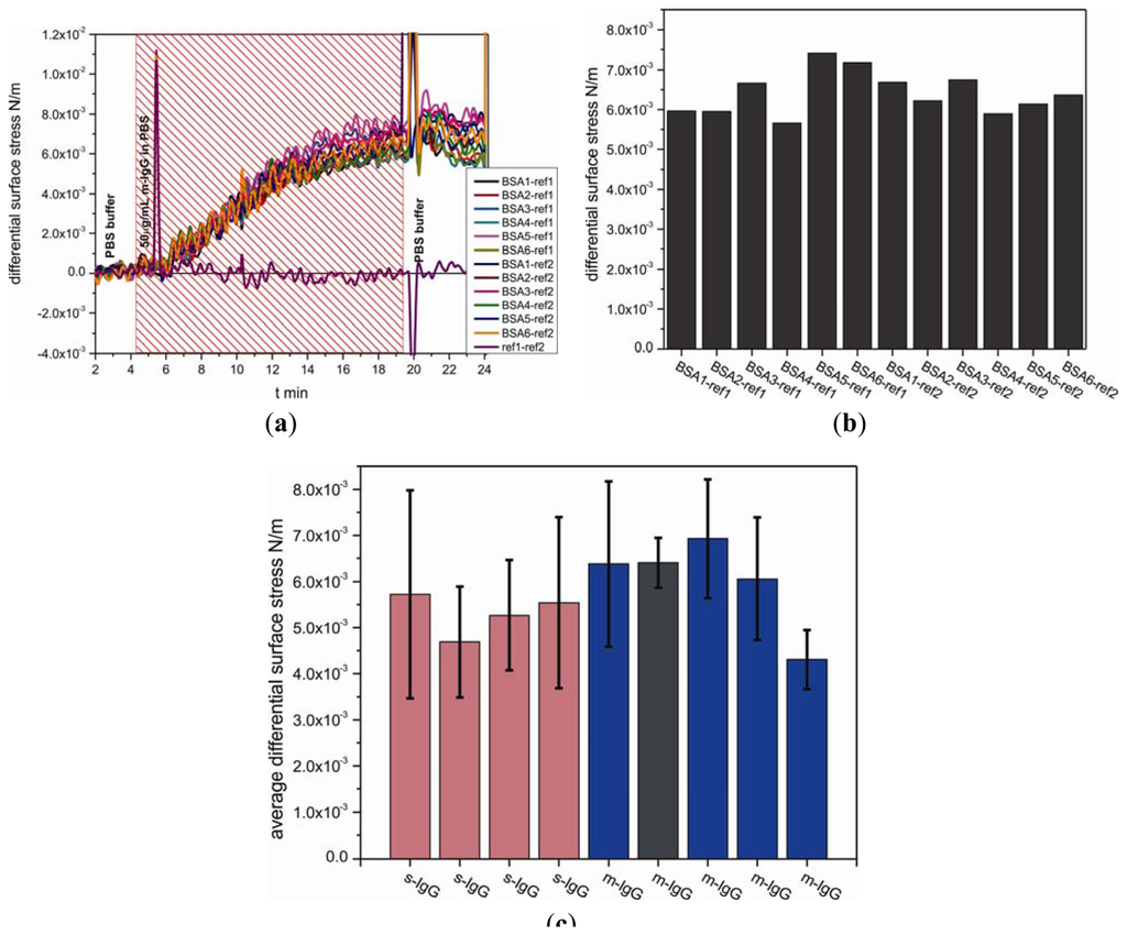 The measurements were carried out on nine separate cantilever arrays comprising total 38 individual sensors and 27 references cantilevers, i.e., 65 out of 72 cantilevers, 112 differential measurement curves in total. In a separate experiment for detecting antibodies, functionalized biotinylated BSA cantilevers were exposed to m-IgG at a concentration of 50 μg/mL. Figure 6(a,b) show measurement curves for one out of nine analyzed arrays. To evaluate the binding performance of the antigen cantilever arrays, the average differential surface stress (Figure 6(a)) and standard deviation values (Figure 6(c), black error bars) were calculated from all possible combinations between sensor and reference cantilevers within each individual array shown in Figure 6(b). The data compiled in Figure 6(c) represent averaged differential bending signals obtained for each of nine individual cantilever arrays. For testing the reproducibility with different sensor cantilevers from m-IgG and s-IgG, we observed no significant difference between the binding of m-IgG (shown in blue bars including dark grey bar) and s-IgG (shown in pink bars), as expected for the conditions chosen. The results clearly demonstrate that the binding between IgG and BSA is reproducible tensile surface stress with an average differential surface stress of about 5.7 ± 0.8 × 10−3 N/m.