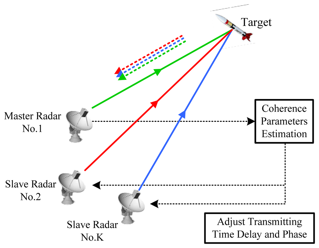 In this paper, we consider NGR with a master-slave architecture, where all the radars transmit signals and only the master radar receives the echoes. It is known that the maximum echo power can be achieved only when we make all the transmitted signals arrive at the target at the same time and in-phase, namely, the coherence gain is obtained via coherent processing. However, the distributed architecture of NGR makes it difficult to coherently combine signals for two reasons. First, the range from a target to different radars may be different, leading to echoes with different propagation time delays and phases; second, each radar has an independent local oscillator with different transmit and receive (T/R) phases, which also adds phase shifts to echoes. Since both the T/R phases and the phase caused by propagation delay can influence the coherence gain, we add the two phases together and name the sum as total phase. In NGR, both the mismatches of time and phase can cause performance degradation. To overcome this shortage, an operation procedure of two steps has been proposed [2]. In the first step which is also called the MIMO mode, each radar transmits a probing signal (usually orthogonal waveforms) to estimate the time delay differences and total phase differences between sub-radars and the master radar, and they are referred to as coherence parameters (CPs) [2–5]. In the second step which is also called the coherent mode, all radars transmit coherent waveforms adjusted by the estimated CPs from MIMO mode. Clearly, the estimation accuracy of CPs greatly impacts the coherence gain that can be obtained by NGR, which raises two important questions: What is the best estimation accuracy for the CPs? How much coherence gain can we get assuming that estimation accuracy is achievable?