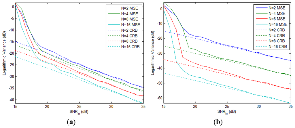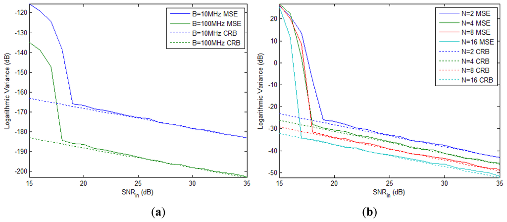 Note that the CRBBΔτk in Equation (62) is irrelevant to β and B. Figure 2(b) depicts the MSE and CRB of the normalized time delay difference for B = 100 MHz with different number of pulses. We see that the MSE under each N value asymptomatically approaches the corresponding CRB curve, and the CRB is decreased by 3 dB when N is doubled.