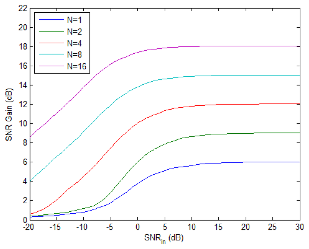 The upper bound of SNR gain in Equation (61) vs. input SNR is plotted in Figure 4 with different number of pulses when K = 2. For a fixed N, the SNR gain ascends from 0 dB to a maximum limit value as the input SNR increases. When N doubles, the maximum gain increases by 3 dB, i.e., more pulses means better performance. Moreover, the input SNR required to achieve a desired SNR gain can be reduced by applying more pulses if we have a fixed number of radars, as can be seen from Figure 4. Finally, it should be pointed out that the SNR gain curves plotted here only provide a performance bound for NGR, since the practical estimation algorithms cannot reach the CRB in the low-SNR region.