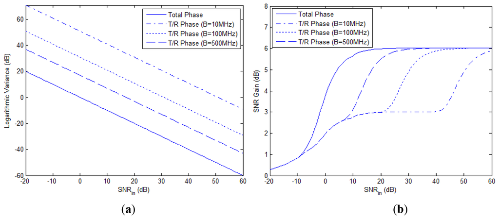 As mentioned in the second remark of Section 3.4, the CRB of the total phase differences in Equation (45) is irrelevant to β and fc, while the CRB of the T/R phase differences derived in [4] is proportional to (fc/β)2. The CRBs of these types of phase errors and the SNR gain based on each of them are shown in Figure 5(a) and (b), respectively, where N = 1, fc = 1 GHz and the bandwidth B increases from 10 MHz to 500 MHz. It is seen that when B is relatively small, e.g., B = 10 MHz, the CRB of the T/R phase differences is nearly 50 dB higher than that of total phase differences and an input SNR of about 60 dB is required to reach the optimal SNR gain of 6 dB, which makes NGR seem impractical with narrowband signal. As mentioned in Section 3.4, performance bound based merely on the T/R phase errors, as done in [4] is inappropriate, for the misalignment of time delay also plays an important role in the performance analysis of NGR. Total phase differences which consist of both the T/R phases and the phase caused by time delay, characterize the signal model more accurately.