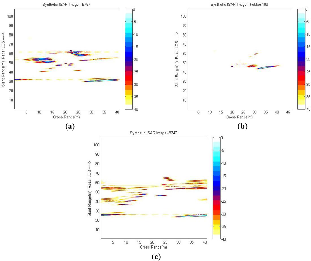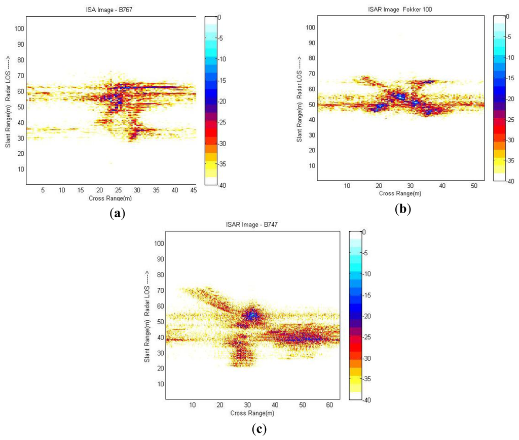 As can be easily noticed, synthetic ISAR images are in many ways different from those obtained from actual data; the images obtained synthetically are much clearer; this is due to the fact that electromagnetic software runs an ideal scheme, without considering any noise or clutter. Synthetic ISAR images do not suffer from measurement noise, and also application of translational motion compensation to HRRPs is not needed for their generation. Moreover, all the aircrafts are considered PEC (perfect electric conductors) in the simulations and also CAD models are approximations of aircraft geometry. Thus, electromagnetic software cannot simulate all the effects present in a real environment. Additionally, for the construction of a good database of synthetic aircrafts the image projection plane (IPP) must be taken into account since the target reflectivity is strongly dependent on the aircraft aspect angle and can affect the recognition process. Moreover, the estimation of the angular velocity of target rotation should be carried out since cross-range scaling of the ISAR image depends on it. In [38,39] an attempt to solve the question of building a robust database can be found taking into account the image projection plane. In [40] an iterative method to estimate the angular parameters of non-cooperative targets using the estimates of the range and radial velocity of two prominent scatterers as inputs is addressed.