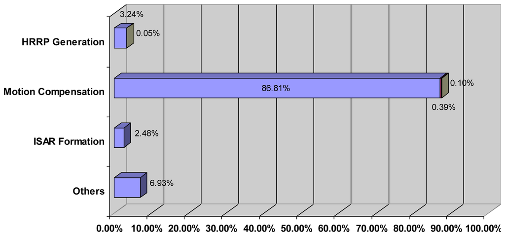 According to Table 2 and Figure 12 the most expensive (computationally speaking) stage is the motion compensation, and more specifically the process of the range bin alignment which involves the realization of (N – 1) circular correlation of M real samples and needs an 86.81% of the total time.