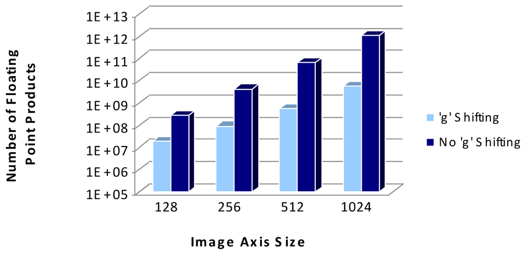 Hence, by using this shifting scheme to carry out image comparisons the computational burden is reduced from an order of magnitude of O(N4) to an order of O(C·N2). As an example, for the comparison of two 256 × 256 images with a shift of g = 16 pixels, from Equation (3) the number of correlations needed to obtain a result is C = 1,378 whereas if shifting was not applied a total number of N2 = 65,536 correlations would be executed. Figure 14 compares the order of magnitude in a logarithmic scale of normalized cross-correlation when image shifting method is applied or not, with “g” being 16 pixels.