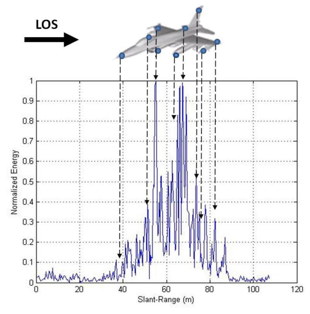 To high resolution radars (HRRs) targets appear as comprised of individual scattering points, also called scattering centers, backscatter sources or scatterers [7]. Figure 2 shows an example of these scattering centers projected on the radar line of sight direction. At a given viewing angle (target aspect angle), each scatterer reflects energy at a certain amplitude and phase. High resolution radars have the ability to discern the different scattering centers of a target in both the propagation and the transversal direction of the transmitted energy; being able, therefore, to identify the geometry of a target. Thus, resolution of these radars is defined in two dimensions, on the one hand there is the slant-range resolution which depends on the radar bandwidth and is defined as the ability to resolve scatterers in the direction of the radar line of sight; on the other hand, there is the cross-range resolution which depends on the wavelength of the emitted signal and the angular sweep made during the illumination time. Cross-range resolution is defined as the ability to resolve scatterers in the normal direction to the plane containing the radar line of sight and the target rotation angle.