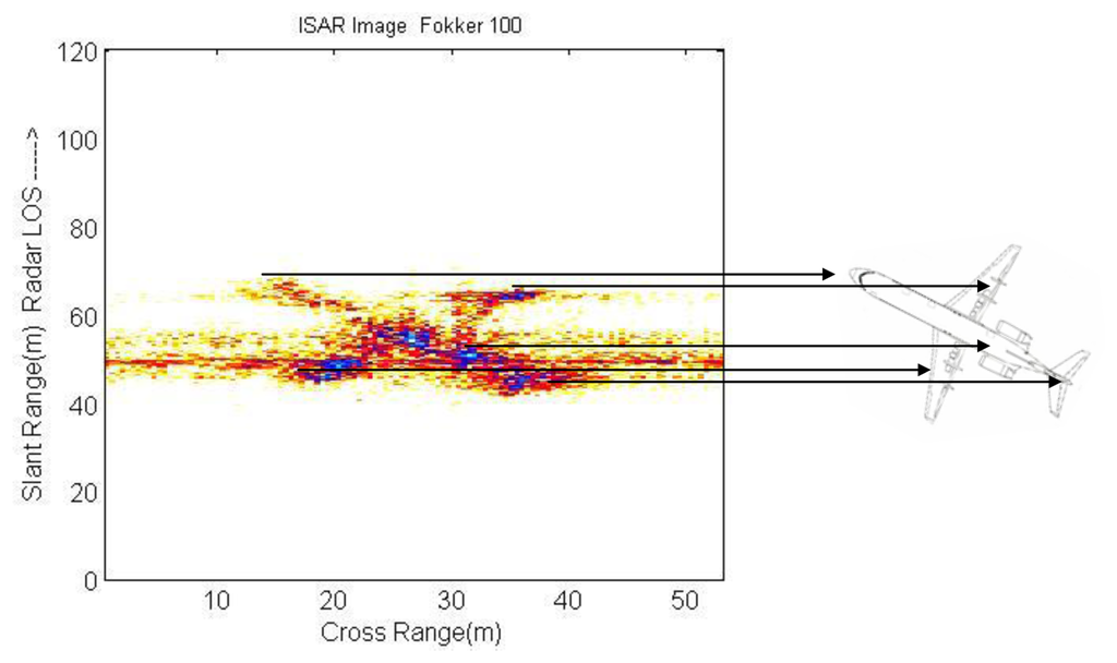 On the other hand, 2D images, named ISAR images, represent the geometry of a target in both slant- and cross-range. ISAR images contain information of consecutive HRRPs with small angular variation; these images display the distribution of scattering centers within a target in the perpendicular direction of the target's rotation plane [14]. Figure 4 depicts the fact that ISAR images present the scattering centers of a target in two dimensions. The aircraft displayed in this figure correspond to a Fokker-100.