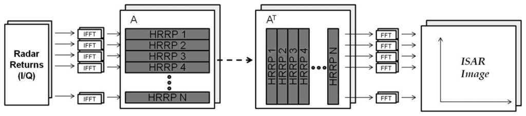 Signal processing needed to achieve ISAR images is complex and implies higher computational burden than that needed for the generation of HRRPs. There are several methods used in literature to form ISAR images including back-projection methods [15] or range-instantaneous Doppler algorithms (RID), such as Radon-Wigner transform (RWT) method [16], joint time-frequency analysis method [17], reassigned smoothed pseudo Wigner-Ville distribution [18], fractional Fourier Transform [19], etc. The algorithm used in this paper for the creation of ISAR images is called range-Doppler algorithm (RDA) [7,9]. This technique is the most common since it is the simplest one. It mainly consists in the application of a double Fourier transformation; first, an inverse Fourier transform is applied to the quadrature demodulated data (I/Q samples) in order to obtain a matrix filled with high resolution range profiles and second, a Fourier transform is applied to every range bin of these profiles in order to acquire information of the scatterers in the cross-range dimension. The basic approach of this algorithm is depicted in Figure 5 where A denotes the profiles matrix and AT is its transpose.