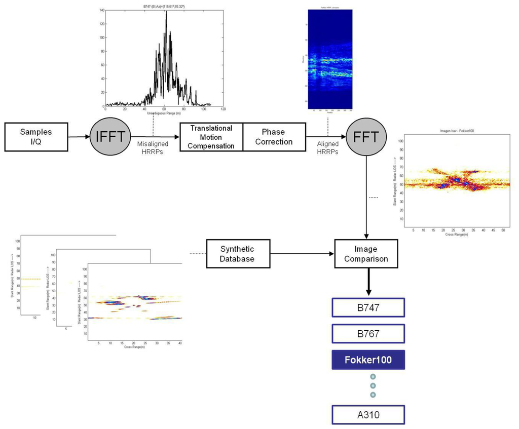 The complete system under study is implemented in Matlab® (R2008a) and consists, firstly, of the generation of an ISAR image from a dataset of flying aircrafts. To that end, motion compensation of high resolution range profiles must be implemented. Secondly, after an ISAR image is obtained, the comparison with a database of ISAR images is carried out with the final purpose of aircraft recognition. This database is populated with ISAR images generated synthetically with electromagnetic software. Figure 6 depicts the flowchart of this procedure.